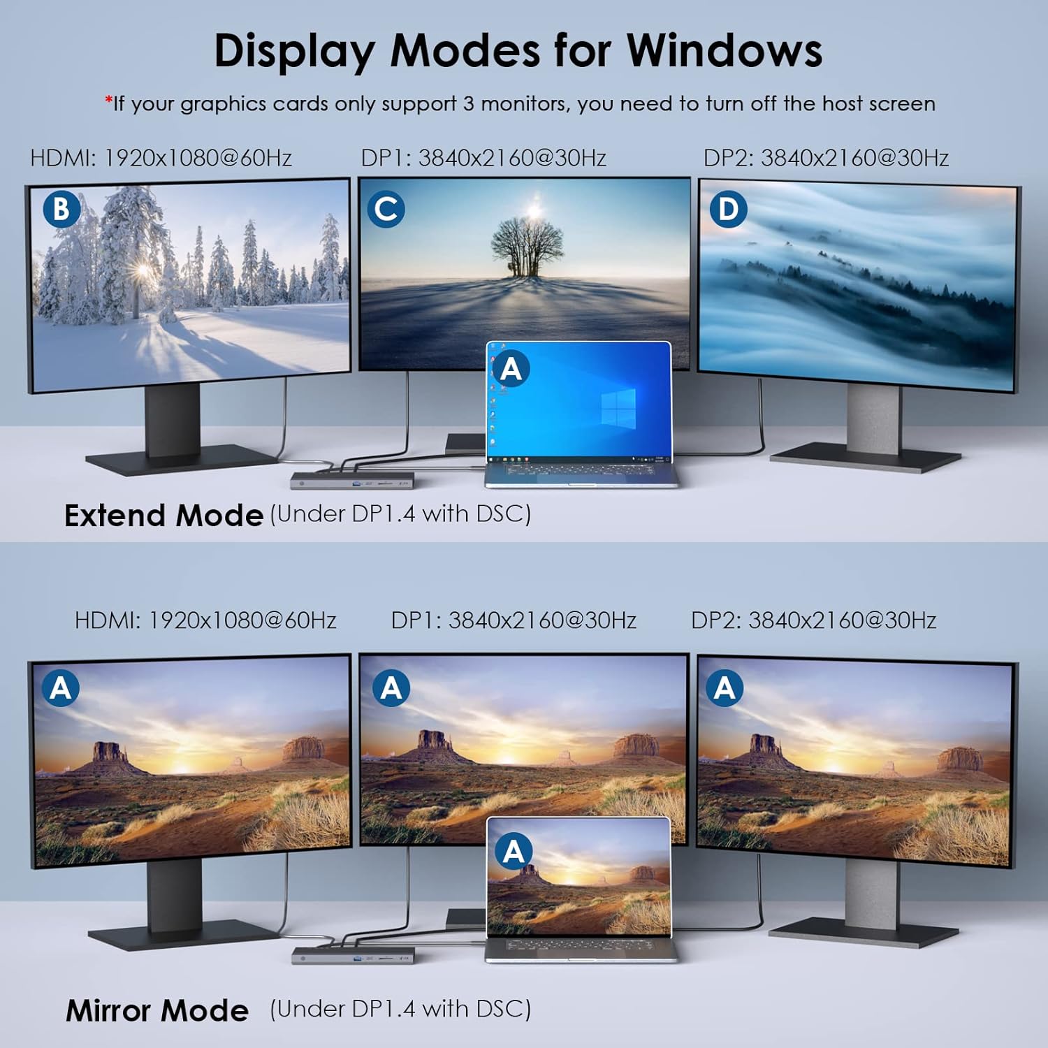 - Triple Display or Dual Monitor: Equipped with dual DP and one HDMI port,Single DP can up to 4K@120Hz under DP1.4 source. Resolution will be 4K@60Hz if two monitors play simultaneously.Connect up to three monitors simultaneously.it perfect for expanding multiple displays for meetings, presentations, stock chart analysis, programming, and more.(Pls Not: Please make sure that the USB-C port on the host laptop supports video output)