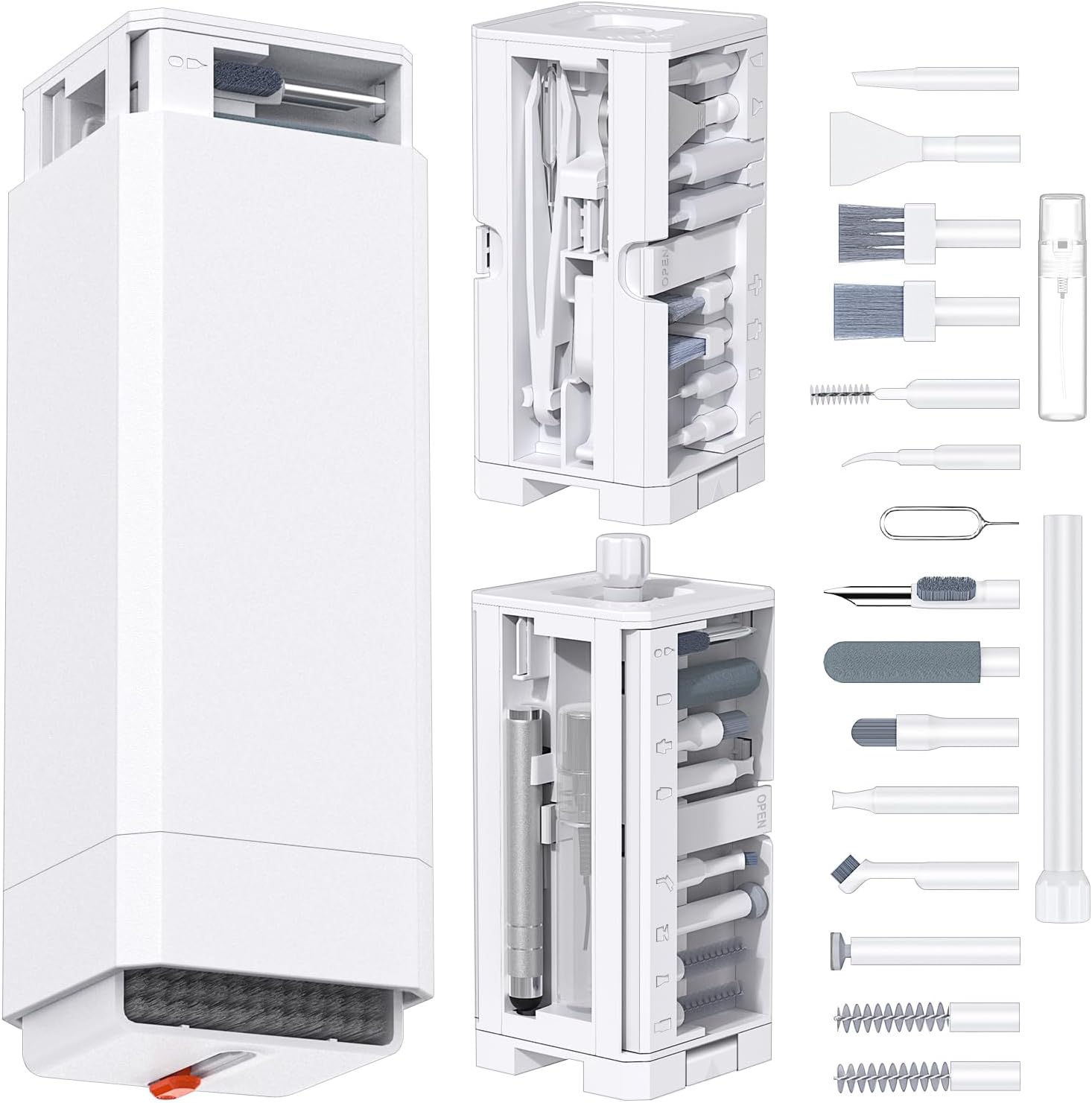 - Upgraded Cleaning Kit: The keyboard cleaner kit comes with a variety of accessories. It can clean phone's charging port&speaker, screen, cameras, headphones, keyboard and computer. The main body that holds all accessories can even store SD card and sim card. Easily handle the different cleaning needs of electronic devices.