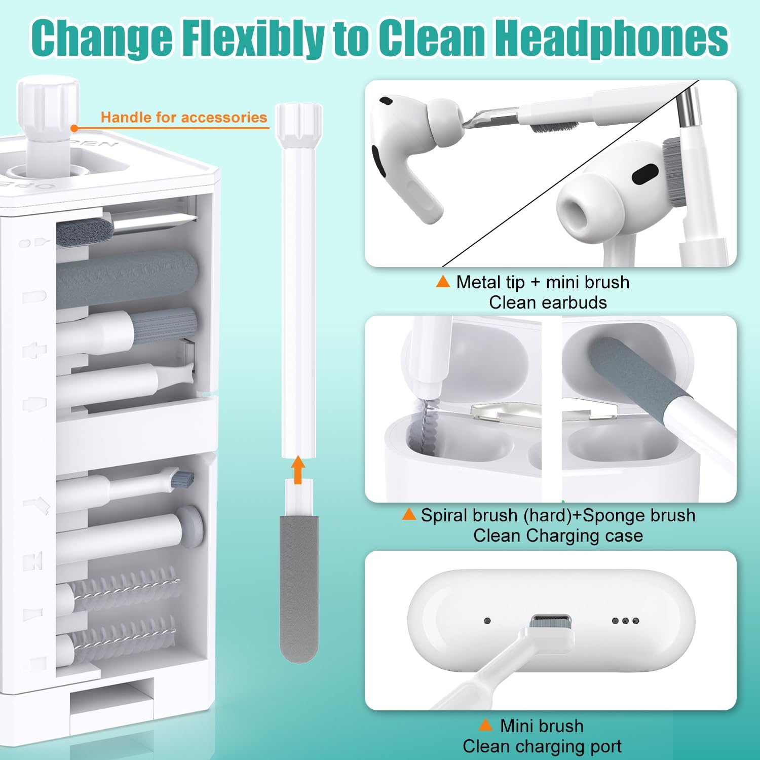 - Headphones Clean Like New: Headphone cleaning pen with a metal tip can clean stubborn dirt, a mini brush cleans the earphone mesh; a round sponge brush and soft brush can clean the dust and dirt hidden in the deep of the charging case. There is an extended handle matches these accessories, making them easier to use.