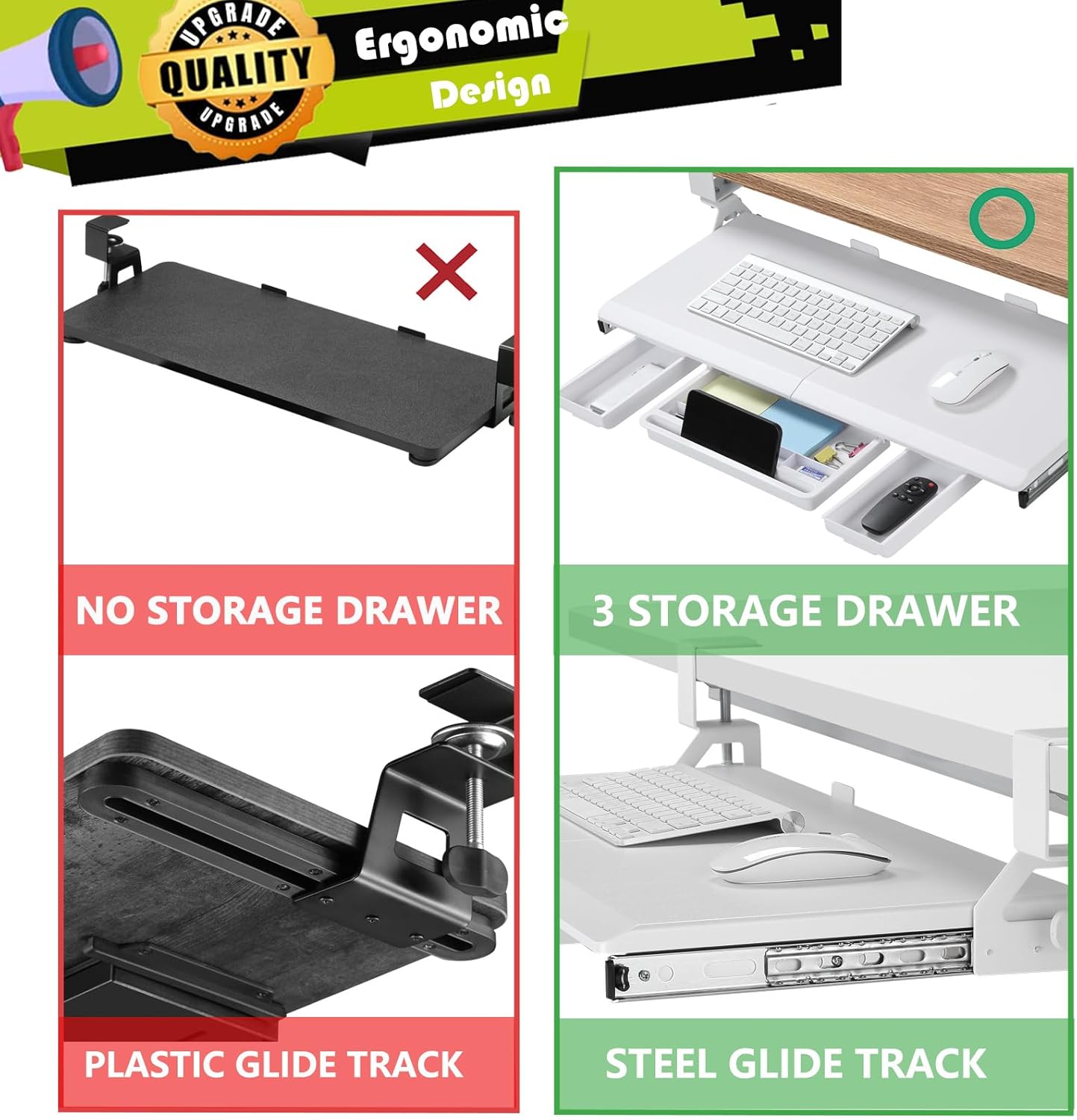 - Maximize Desk Space & 3 Drawers - The ETHU keyboard tray is designed to save desk space with its 26.77” (31.18" with clamps) x 12.2” size, allowing you to fit your keyboard, mouse, and small accessories beneath your desktop. Underneath the keyboard, 3 drawer storage adds valuable extra workspace for your phone and other items