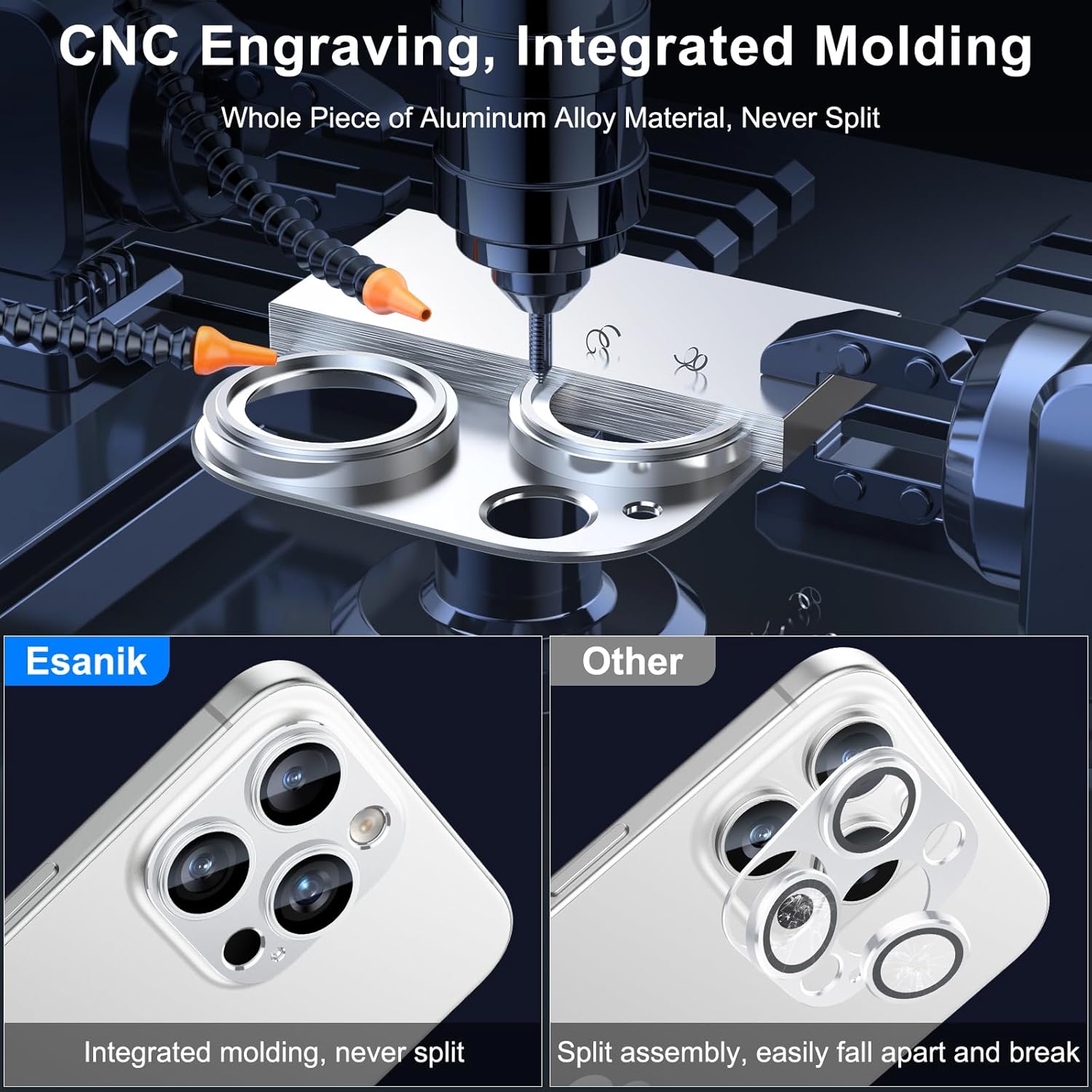 - 【CNC Engraving & Integrated Molding】 Esanik 2024 Upgrade Version iPhone 16 pro max / iPhone 16 Pro Cam Cover is precisely carved from whole piece of high-quality aluminum alloy, firm and long lasting. Bid farewell to the split and falling apart issues resulting from the conventional split assembly process.