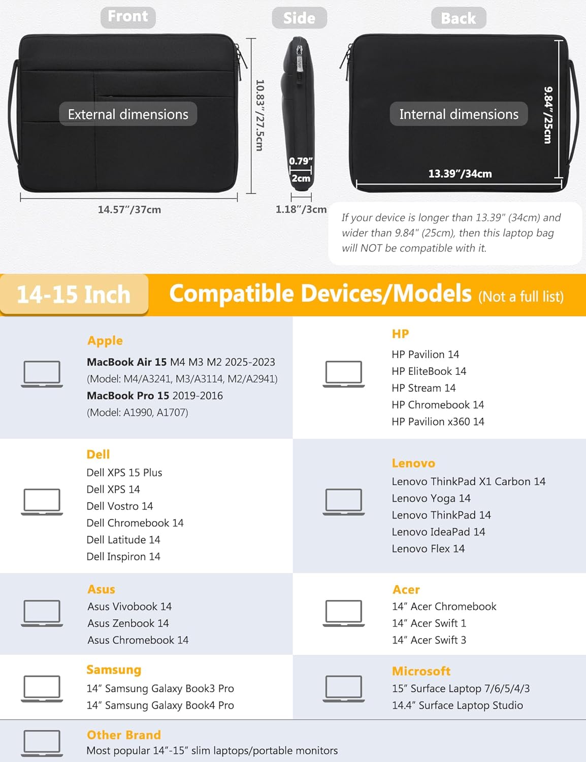 - Internal Dimensions: 13.39" x 9.84" x 0.79". Compatible with MacBook Air 15 M4 M3 M2 2025-2023(A3241, A3114, A2941), MacBook Pro 15 2019-2016(A1990, A1707), 14.4" Surface Laptop Studio, 15" Surface Laptop, 14" HP Pavilion/EliteBook/Stream/Chromebook/Pavilion X360, Dell XPS 14/15 Plus, 14" Dell Vostro/Chromebook/Latitude/Inspiron, 14" Asus Vivobook/Zenbook/Chromebook, ThinkPad/IdeaPad/Flex/Yoga 14, ThinkPad X1 Carbon/Yoga 14, 14" Samsung Galaxy Book3/Book4 Pro,etc.