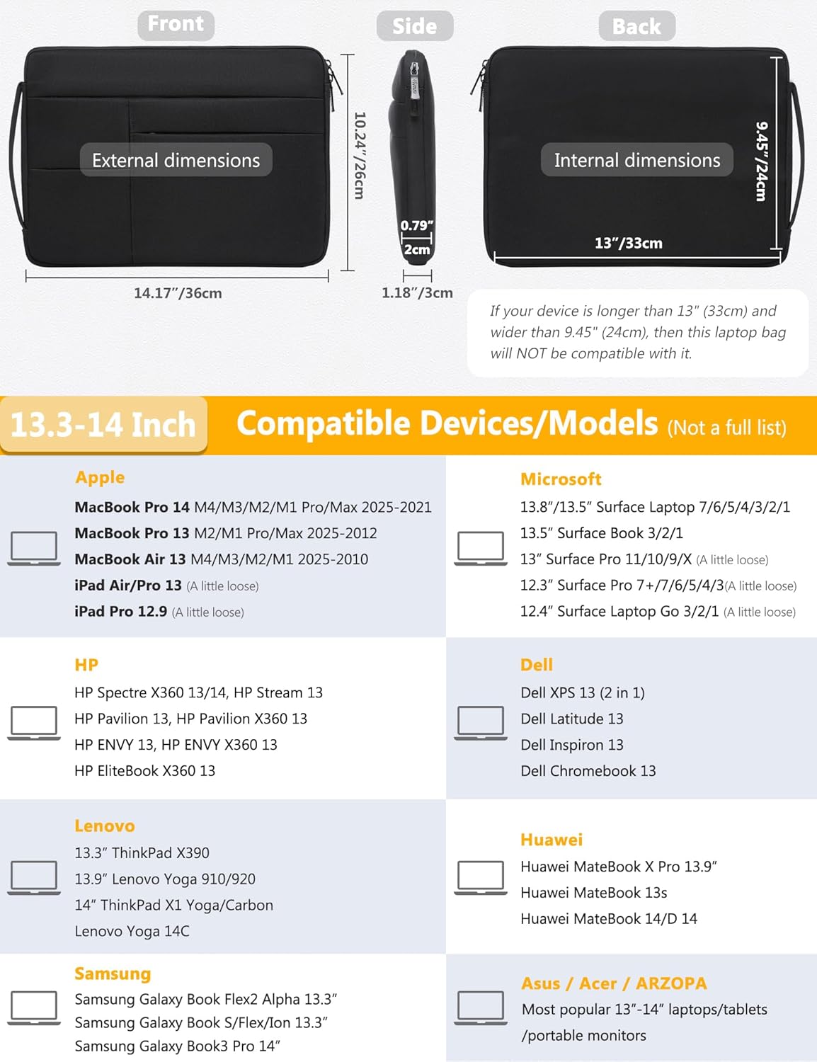 - Internal Dimensions: 13" x 9.45" x 0.79"(33 x 24 x 2 cm). Compatible with MacBook Pro 14 M4/M3/M2/M1 Pro/Max 2025-2021(A3401 A3185 A3112 A2992 A2918 A2779 A2442), 13.8"/13.5" Surface Laptop, 13.5" Surface Book, MacBook Pro/Air 13, iPad Pro/Air 13, iPad Pro 12.9, HP Spectre X360 13/14, HP EliteBook x360 13, HP Envy/Stream/Pavilion 13, Dell Latitude 13 3000 series, Dell Inspiron/Chromebook 13, Asus ZenBook 13, ThinkPad X390 13.3, ThinkPad X1 Carbon, 13.9" Lenovo Yoga 14C, Huawei MateBook D14, etc.