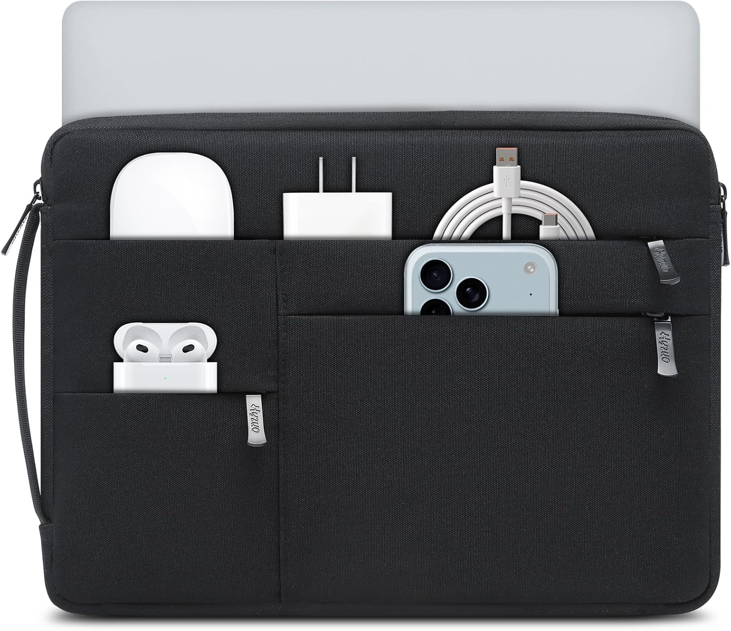 - 3 Front Pockets: There are 3 different sized pockets on the front, allowing you to choose the right pocket for storing different sized items, keeping them organized and easy to find. They have enough room to place your on-the-go accessories such as charger, cords, flash drives, mouse, earbuds, stylus, pens, notebooks or other small items. They are zippered closure to ensure that all your items are always safe