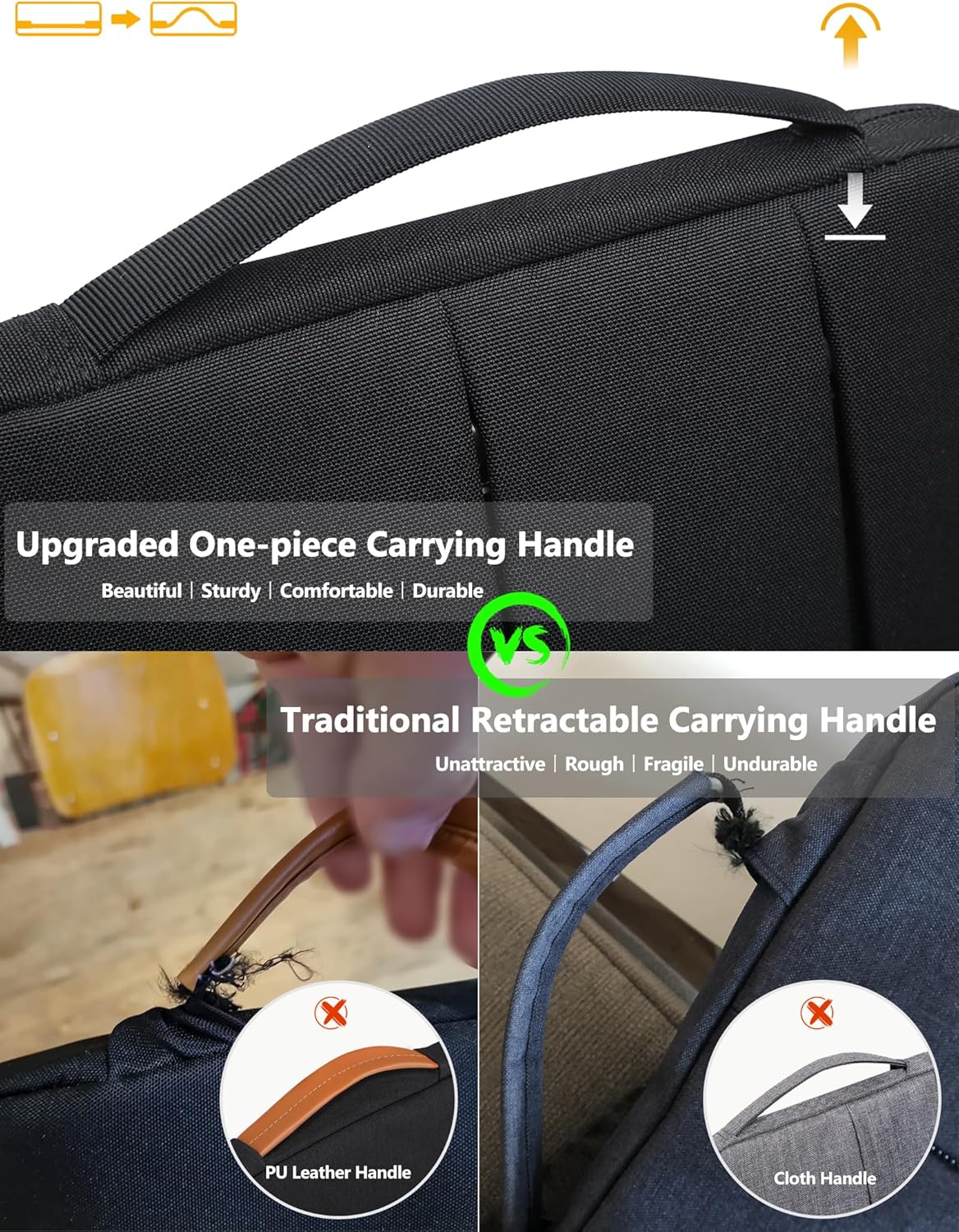 - Upgrade One-piece Carrying Handle: The short side end has a carry handle for easy carrying when you're on the go. It connects seamlessly to the main part of the laptop bag and is molded in one piece. The handle is made of fine nylon webbing with internal padding embedded to increase comfort while reducing pressure on the hand. All seams are reinforced and double stitched for strength and durability