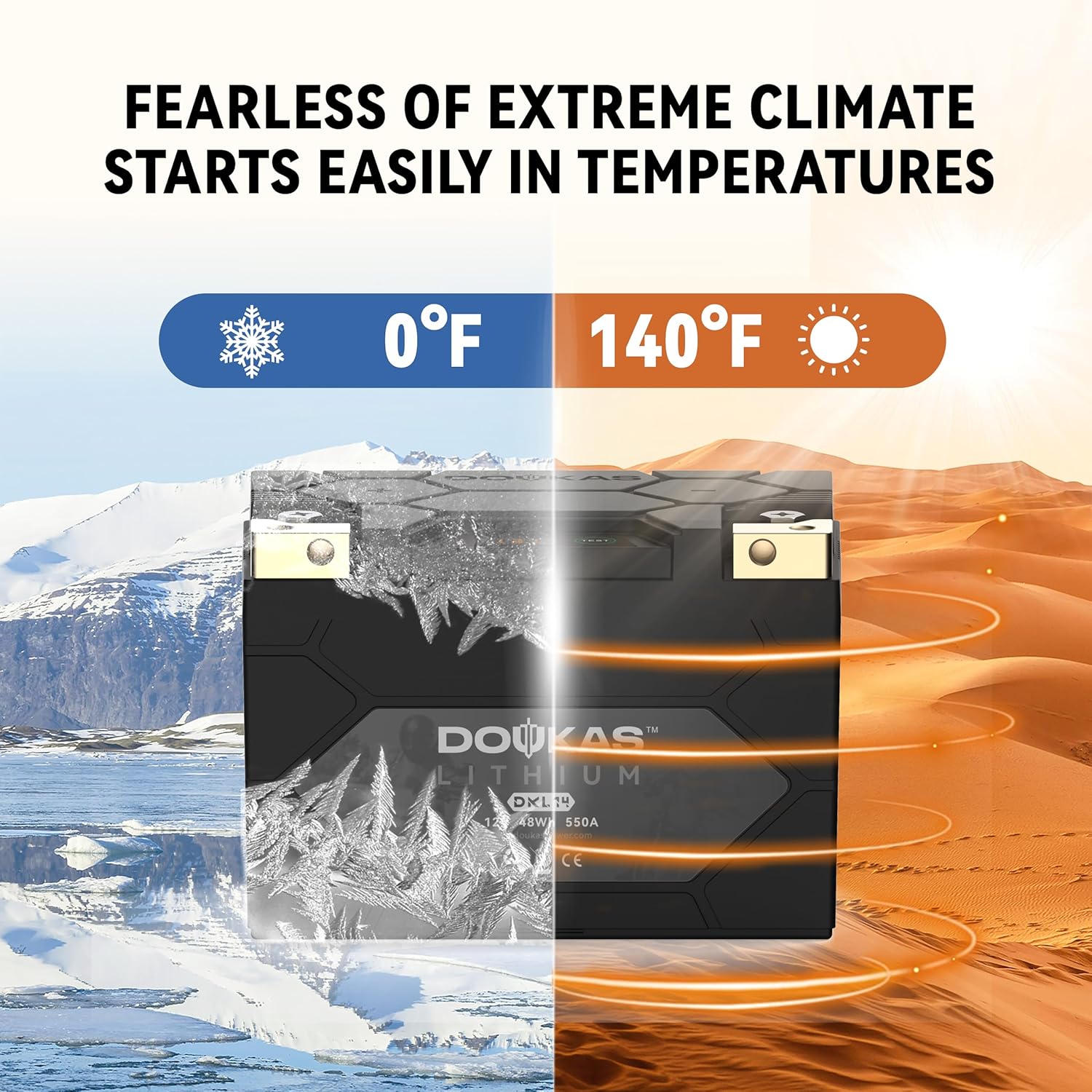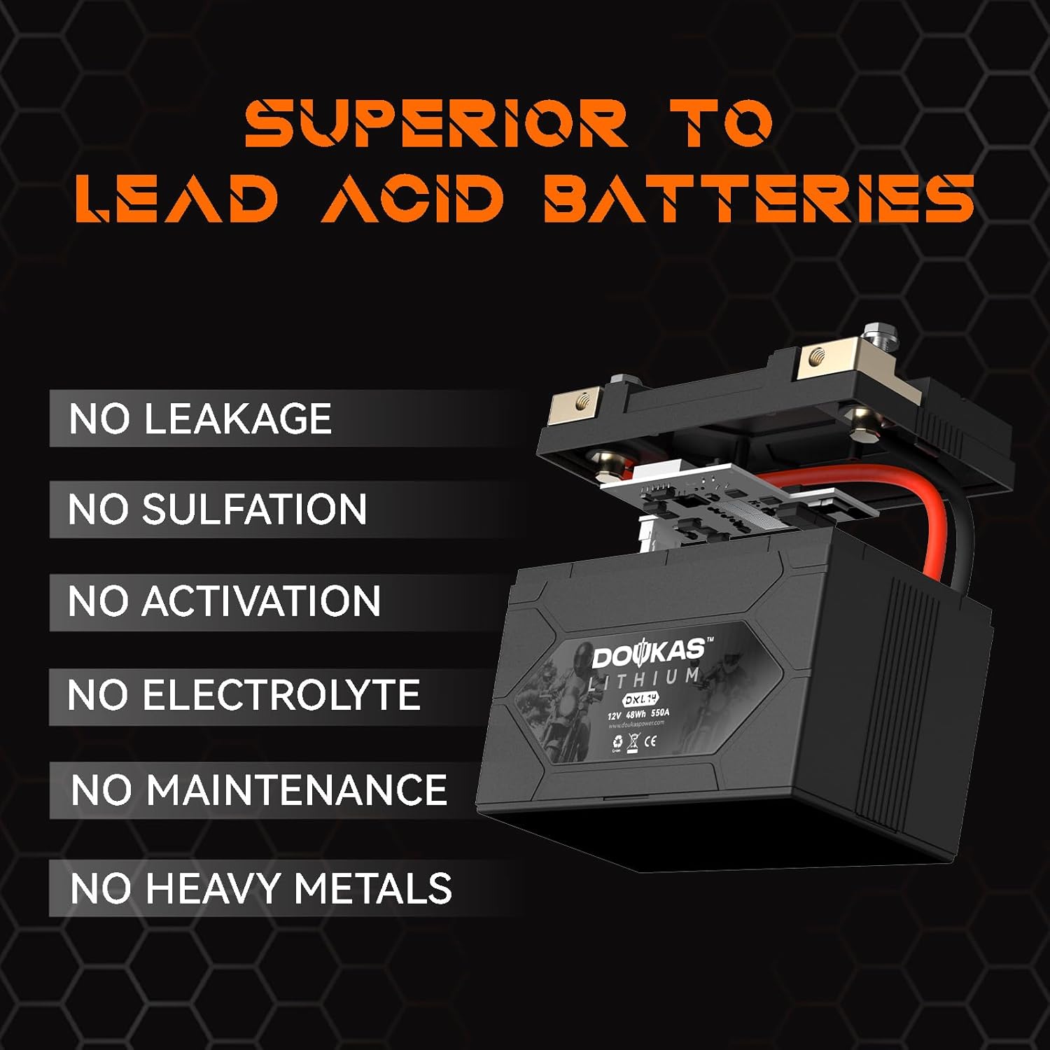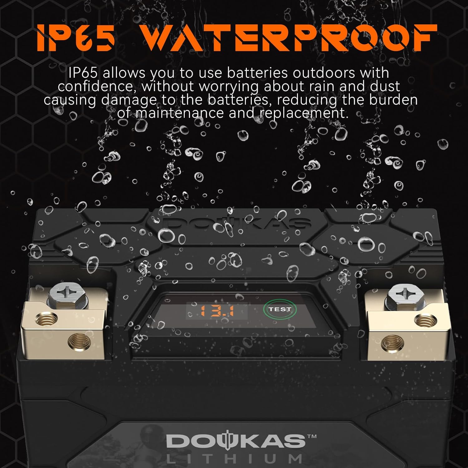 - HIGH PERFORMANCE AND LIGHTWEIGHT: DOUKAS lithium-ion powersports batteries deliver over 550 Amps of starting power. Compared to lead-acid batteries, it offers 3X starting power and 5X more service life. Weighing just 2.16 pounds (approximately 0.98 kg), it's about 1/3 the weight of lead-acid batteries, but boasts 3-5 times the energy density.