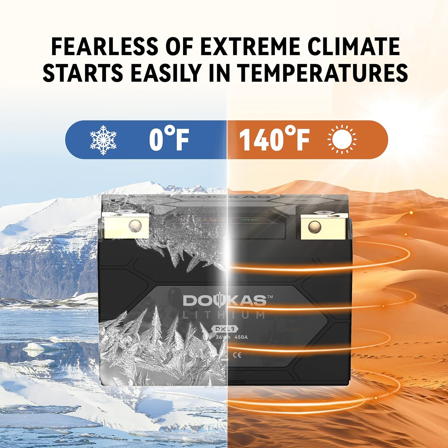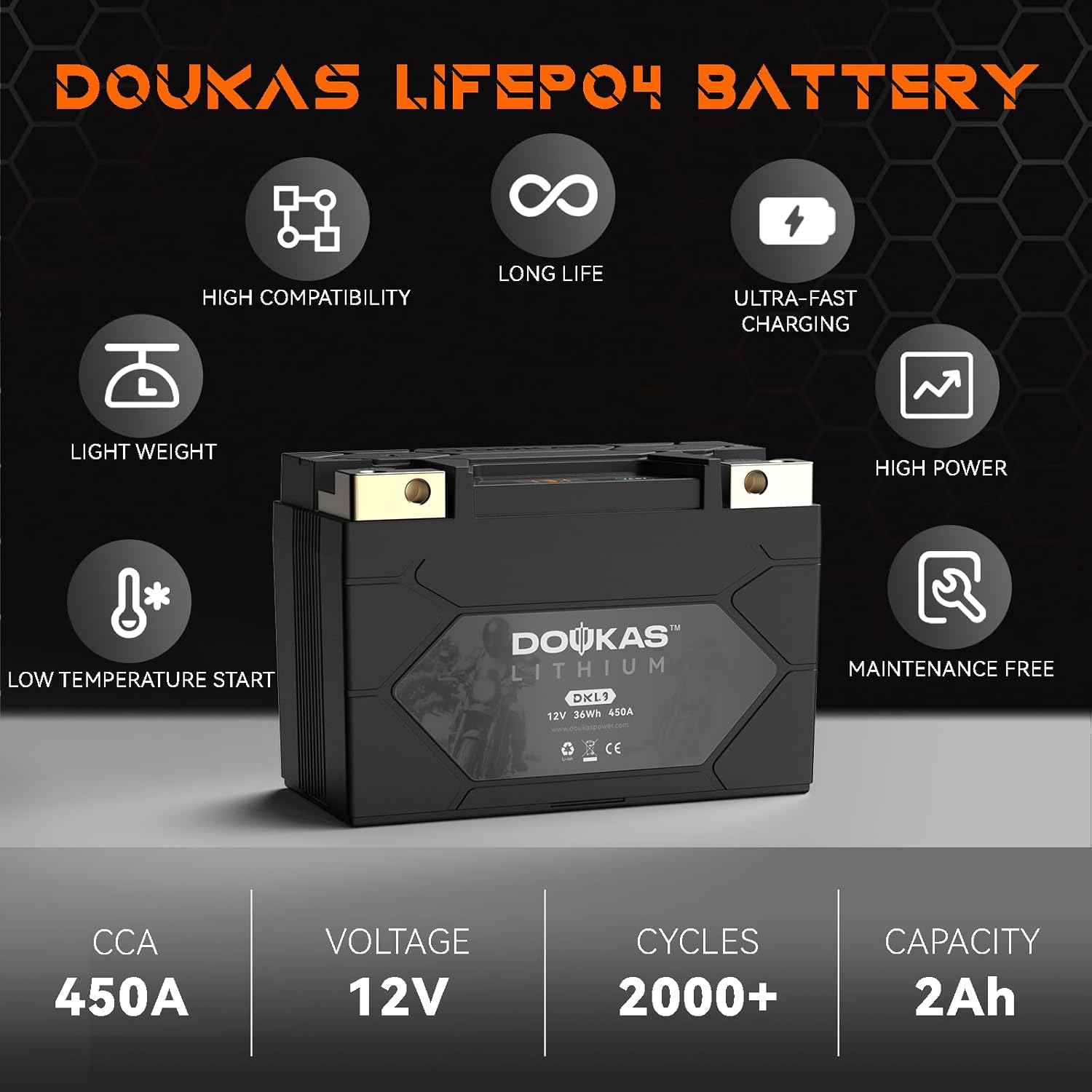 - HIGH PERFORMANCE AND LIGHTWEIGHT: DOUKAS lithium-ion powersports batteries deliver over 450 Amps of starting power. Compared to lead-acid batteries, it offers 3X starting power and 5X more service life. Weighing just 1.41 pounds (approximately 0.64 kg), it's about 1/3 the weight of lead-acid batteries, but boasts 3-5 times the energy density.