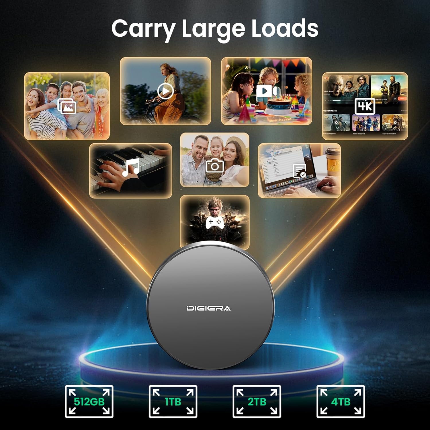 - Wide Compatibility for Effortless Integration: The DIGIERA solid state drive features universal compatibility with a USB Type-C interface, working seamlessly with laptops, tablets, gaming consoles, and most smartphones. Its plug-and-play functionality means instant access for students, freelancers, and multitaskers on the go. NOTE: Only compatible with iPhone 15 series and newer. Not compatible with iPhone 14 and earlier models
