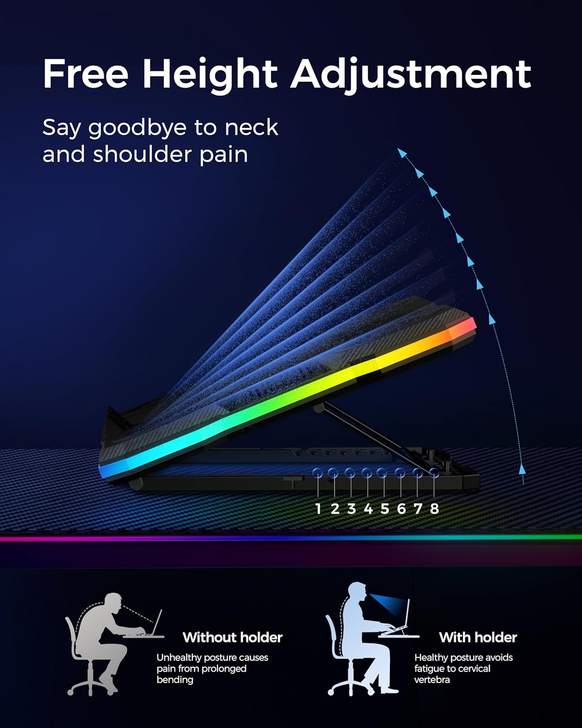 - Ergonomic comfort: The gaming laptop cooling pad provides 8 heights adjustment to choose.You can adjust the suitable angle by your needs to relieve the fatigue of the back and neck effectively.