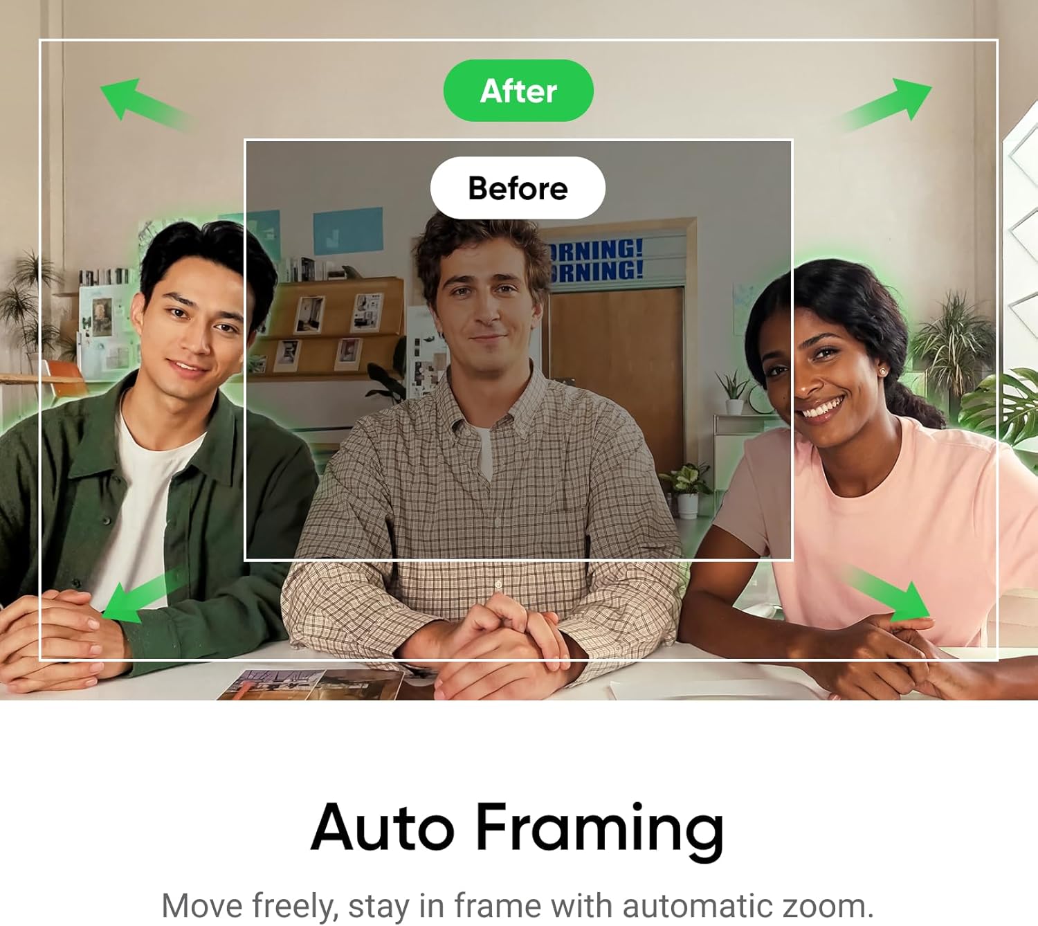 - Auto Framing: Insta360 Link 2C automatically zooms and adjusts to keep everyone clearly in sight, whether it's one person or a group.
