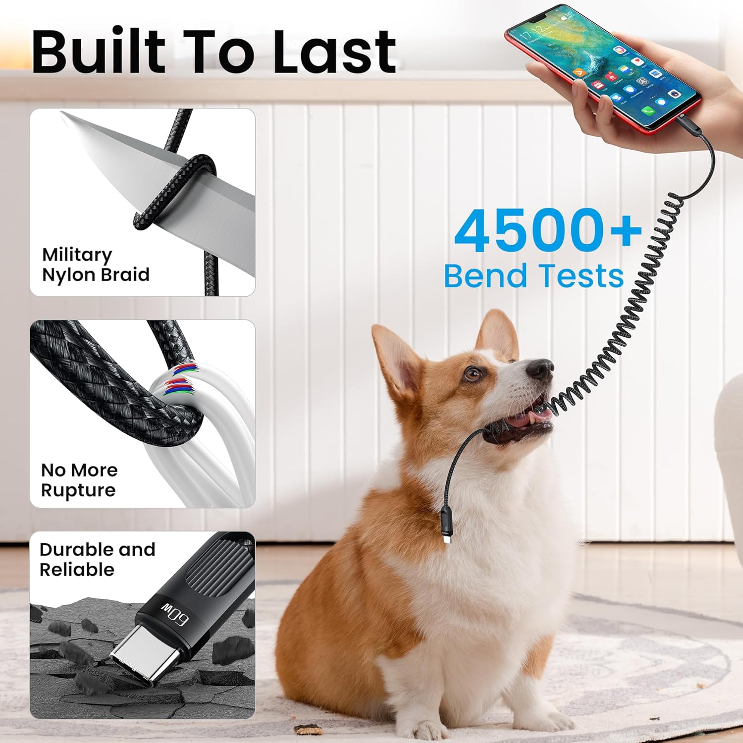 - Military-Grade Durability: Built to last with 10,000+ bend-tested nylon braiding and TPE hybrid jacket, this coiled iPhone charger cord USB C withstands daily stretching and twisting. The aircraft-grade aluminum connectors resist corrosion in humid environments, while the compact form factor makes it the perfect travel companion for business professionals and frequent drivers