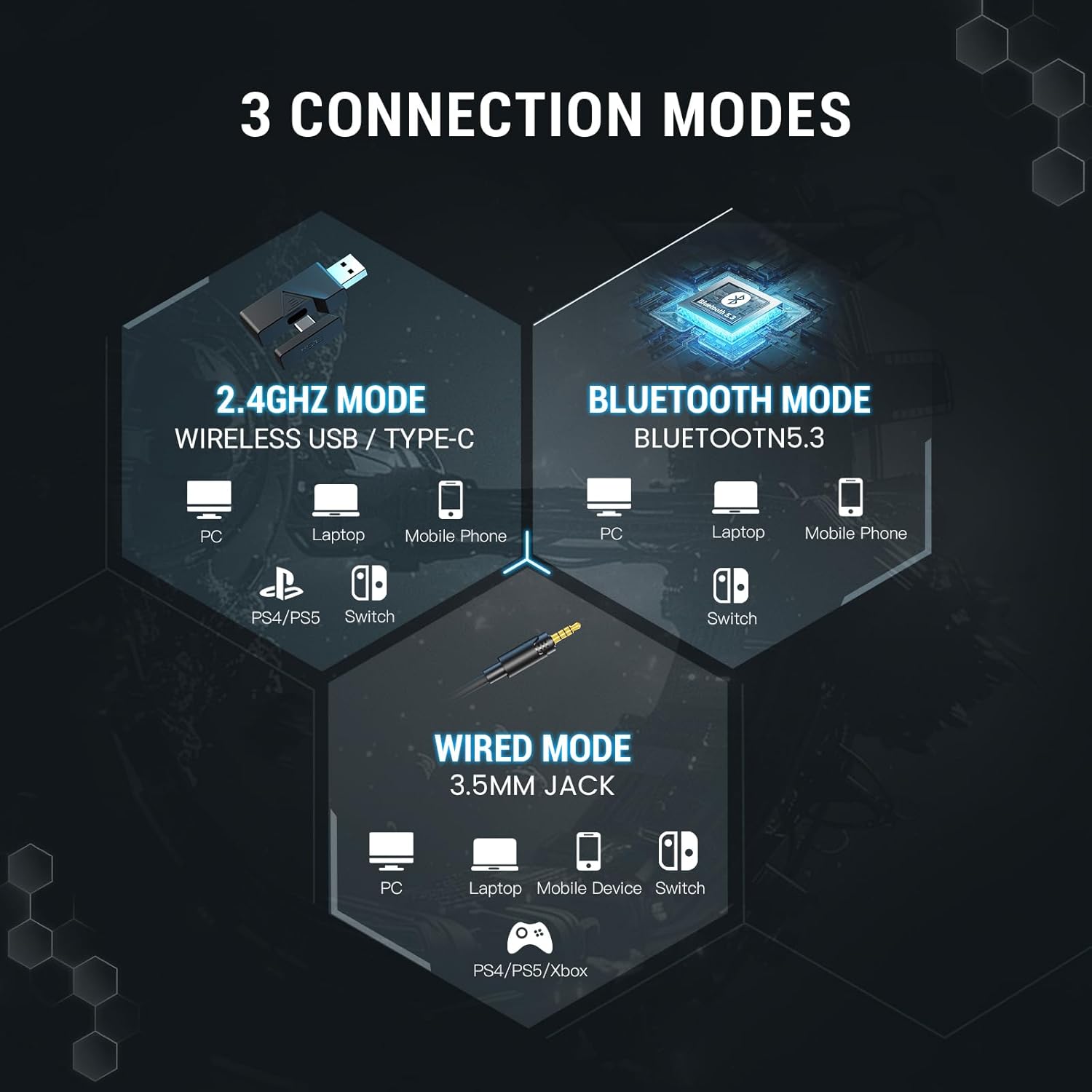 - THREE CONNECTION MODES: The EKSA Stargine BT Gaming Headset offers versatile connectivity options to suit your gaming needs. It features a low latency, lossless 2.4GHz wireless connection (Note: the wireless transmitter chip is located inside the Type-C port, so the Type-C port must be plugged in when using the USB connection), the latest Bluetooth 5.3 mode, and a 3.5mm wired connection. For detailed instructions on how to pair and use the Bluetooth connection, please refer to the user manual. Note :The Xbox Series only works with 3.5mm wired connections.