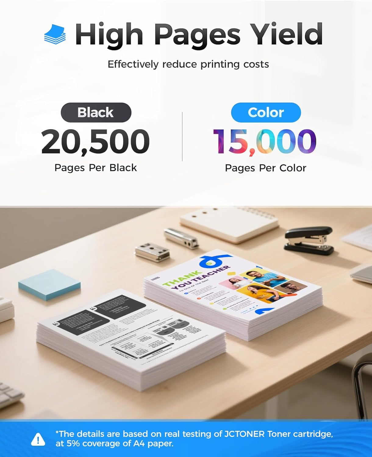 - The latest chip version: The JCTONER toner cartridges are equipped with the latest version of built-in chips, ensuring perfect compatibility between each toner cartridge and the printer. This enables you to print efficiently while maintaining stability and reliability, making installation convenient without the need for manual adjustments. All JCTONER toner cartridges have undergone strict quality testing and have obtained ISO9001 certification. High-quality toner cartridges can meet the demand for high printing volume. The fine toner ensures clear and stain-free printing results and extends the lifespan of the printer. You can purchase with confidence.