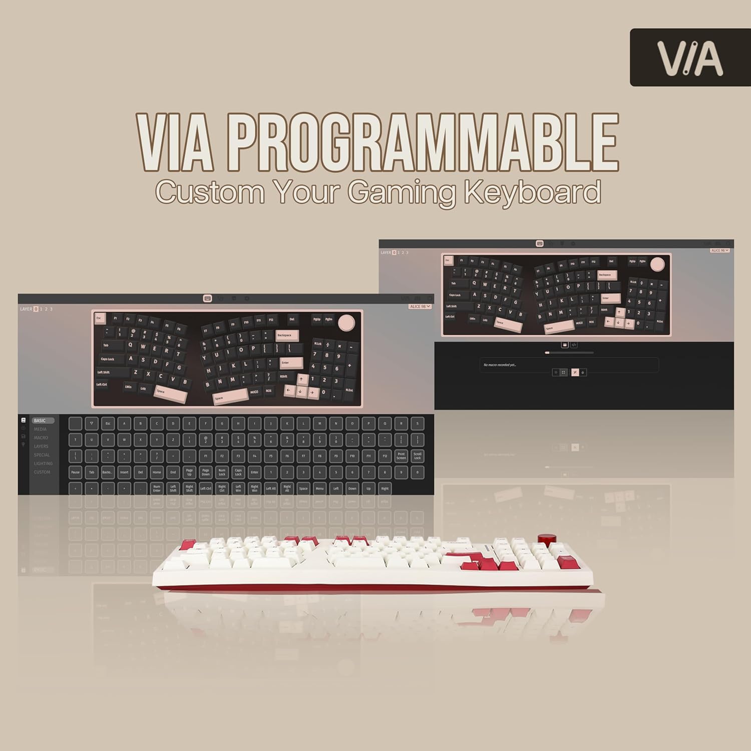 - 【Cherry Profile Dye Sublimation PBT Keycaps】 The Alice98 Keyboard comes with 5 Sides Dye Sublimation PBT keycaps in Cherry profile, known for their fine texture and clear legends. PBT material is more durable and wear-resistant compared to ABS, preventing the keycaps from becoming oily and ensuring a comfortable typing experience.