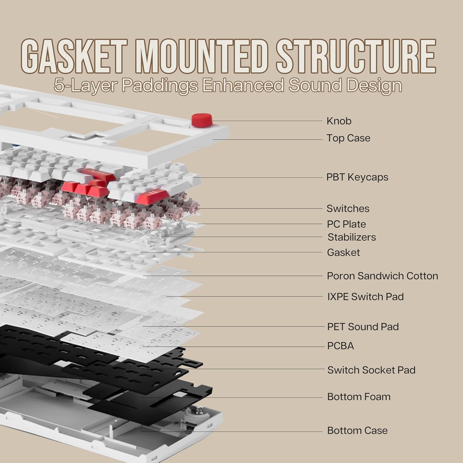 - 【Gasket Mount, PC Plate & Enhanced Sound Design】 Designed for a superior typing experience, the Feker Alice98 mechanical keyboard features a gasket mount structure with a PC plate, offering a soft, consistent typing feel across the entire keyboard. To further enhance the typing experience, the keyboard includes sound-improving materials such as Poron sandwich foam, an IXPE switch pad, PET film, EPDM socket foam, and case foam. These layers work together to minimize noise and provide a rich, satisfying typing sound, making every keystroke a pleasure.