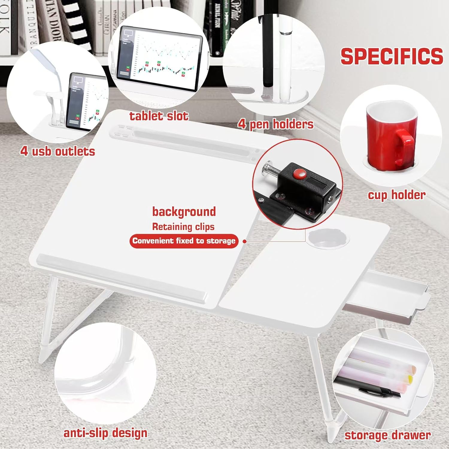 CloudTrip Plus XL Adjustable Laptop Desk with Light, USB Port, iPad Holder, Drawer Storage - Larger 23.6IN Adjustable Lap Desk for Bed, Home Office, Breakfast Tray, Fordable Legs Desk (White)