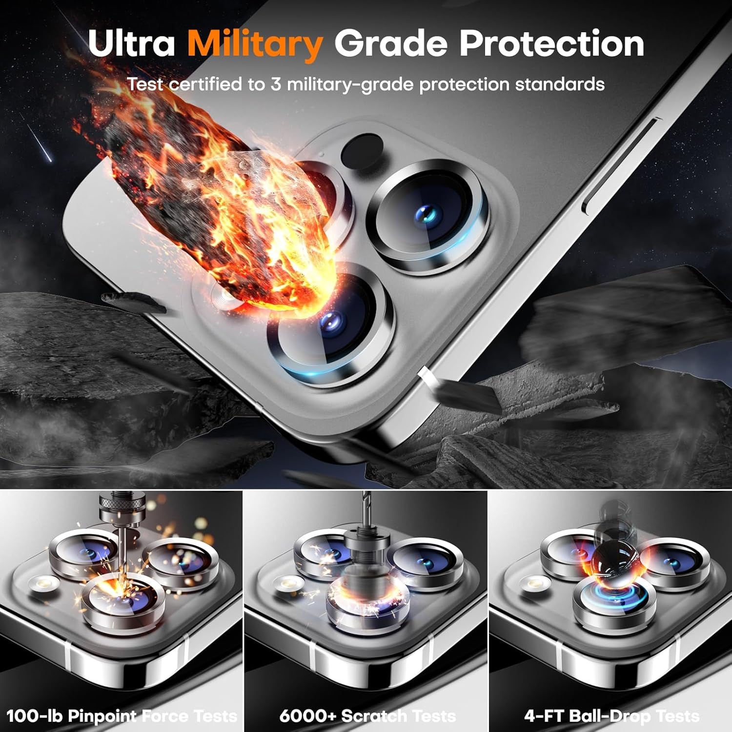 - [HD Metal Individual Lens Protectors] Compatible for iPhone 16 Pro Max/16 Pro/15 Pro Max/15 Pro/14 Pro Max/14 Pro. Enhanced protection and never falls off. Metal with 99% transmittance sapphire glass combination defends every impact angle and crack issue. Electroplating AF oiled technology shows telephoto and macro shots exhibit their original colors.