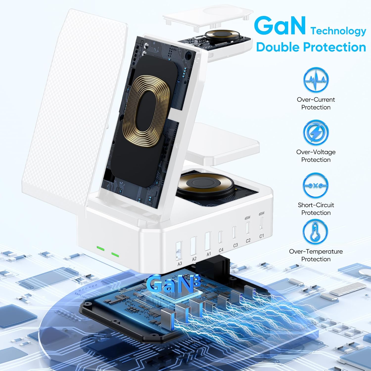- 【300W USB C Charging Station for Multiple Devices】: This desktop multi-port charging station is the perfect solution for charging multiple devices! Our usb c charging station features 2 powerful 65W USB-C ports designed specifically for charging laptops, 2 efficient 30W USB-C ports and 3 versatile 20W USB-A ports . Together with wireless charging station total output can be up to 300W. You can conveniently fast charge your Apple devices and Android devices at the same time.