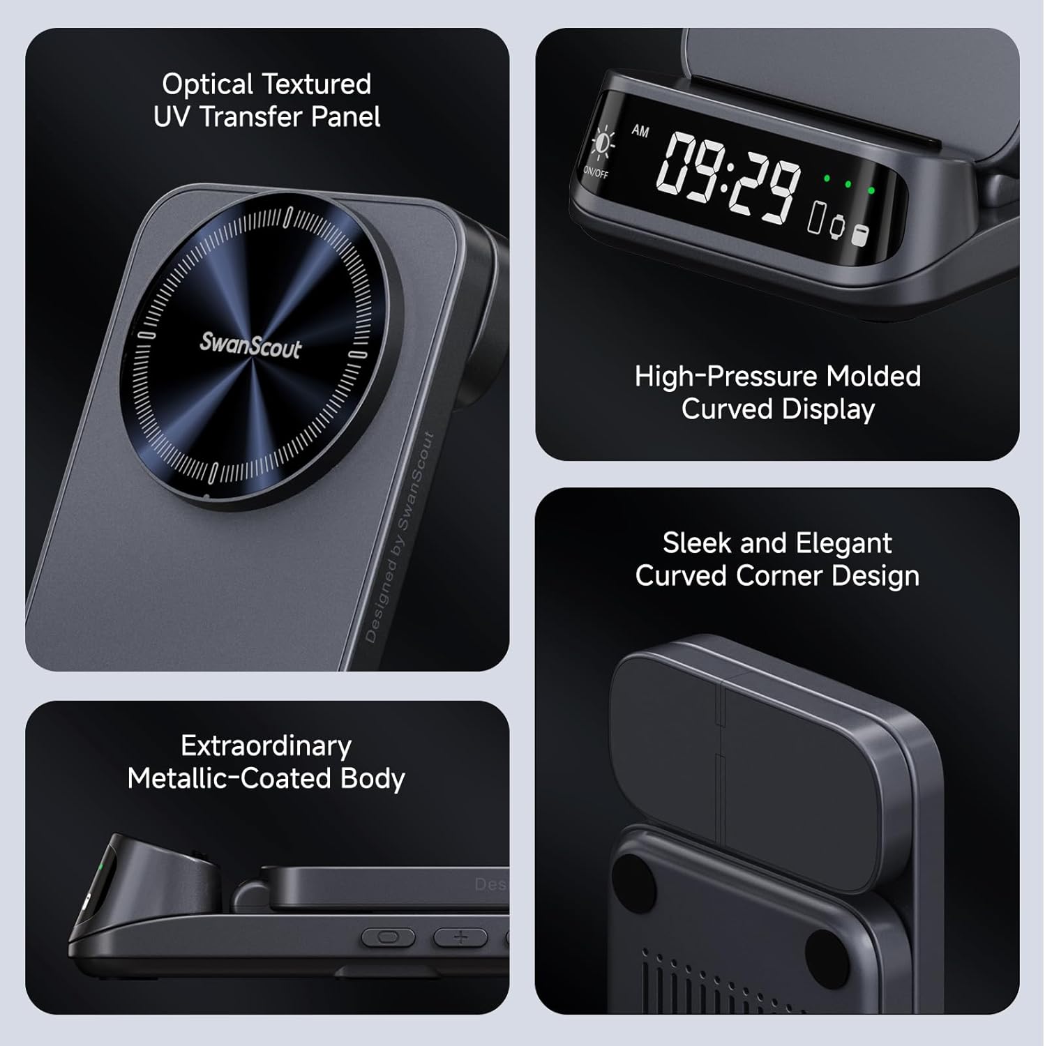 - Stylish Charger - The SwanScout 708M features UV transfer printing with an optical texture on the phone charging section and a metallic paint-coated body for a high-end look and durability. This powerful charger also serves as a stylish accessory, making it a great gift.