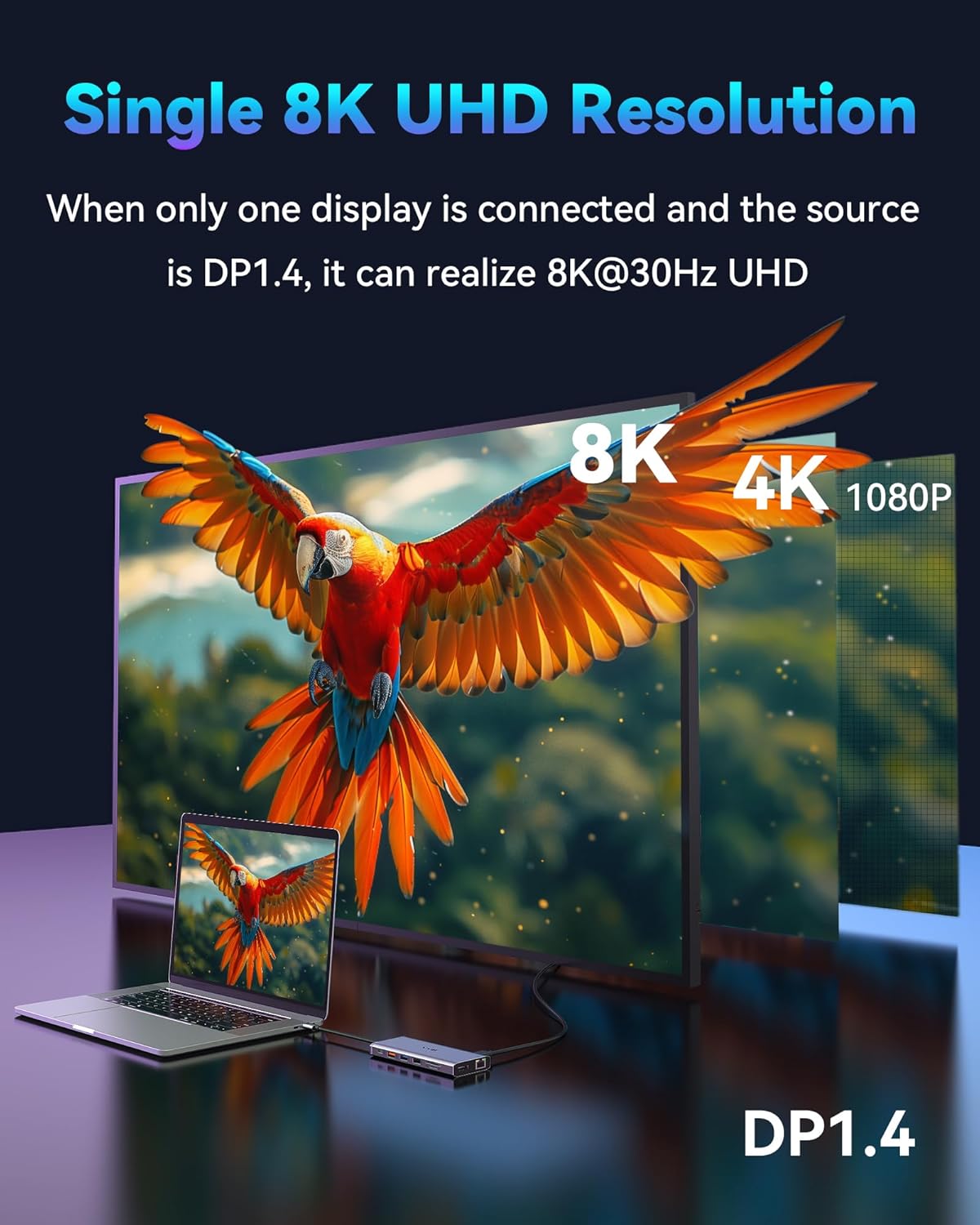 - 8K Docking Station 3 Monitor: This dual HDMI usb c hub support dual monitors will be 4K@60Hz and 4K@60Hz(DP1.4). Triple displays will be 3*4K@60Hz((DP1.4 Source). While single using HDMI port or displayport resolution up to 8K@30Hz or 4K@120Hz resolution. you can enjoy an 8K ultra high definition movie experience and 3D visual effects.NOTE: MacBook laptops only support same image on external monitors. (The hub Not Support Using Converter)