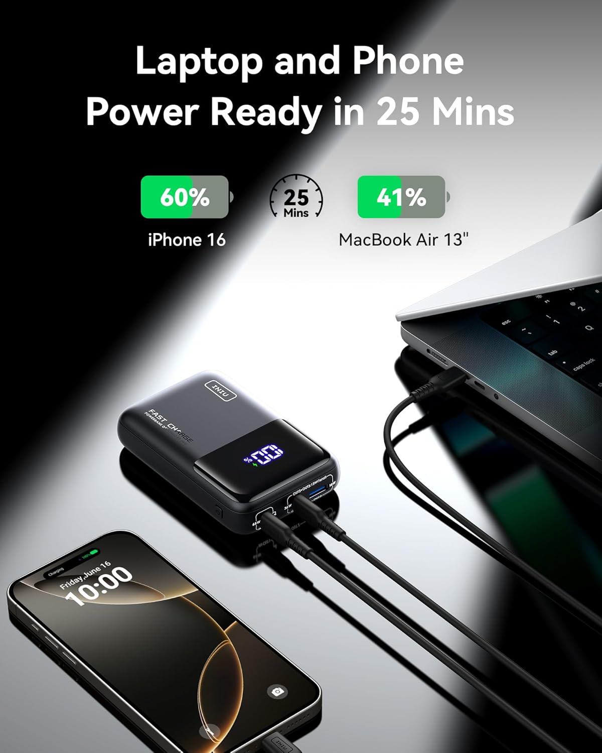 - Power Ready iPhone & MacBook in 25Mins: A must-have for multi-device users, this power bank provides up to 65W high-speed charging for two devices simultaneously. In just 25 minutes, it can charge your MacBook Air 13" to 41% and iPhone 15 to 56%. It also supports Samsung Super Fast Charging 2.0.
