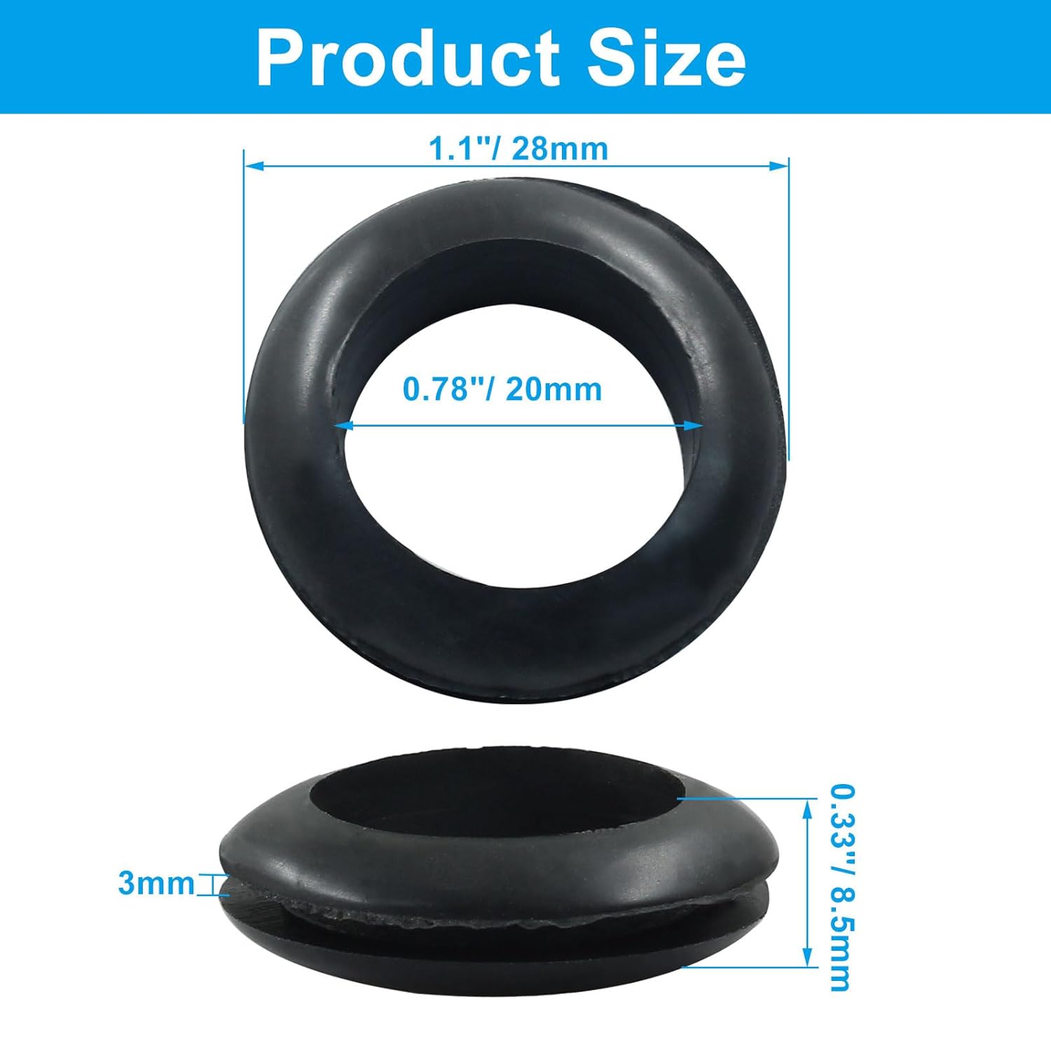 - Package & Size: 24 pcs rubber wire grommet. Inside Diameter: 20 mm/ 0.78". Drill Hole Diameter: 22 mm/ 0.86". Overall Diameter: 28 mm/ 1.1". Groove Width: 3 mm.