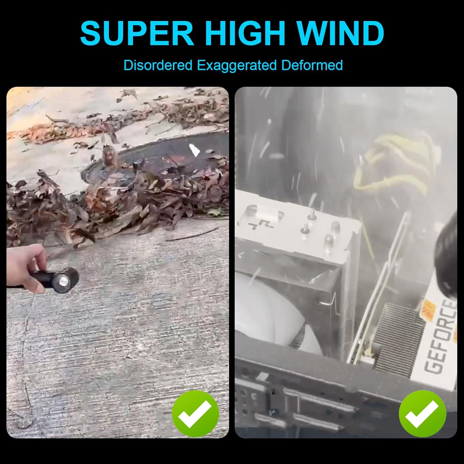 - Multi Use: compressed air duster is a versatile tool, such as is keyboard cleaning kit, electric leaf blower, car detailing supplies,pc duster, snow blower, turbo fan, car dryer, air broom and so on. This air duster is easy to clean keyboard, And car clean, seat, Blinds, camera, pc clean, etc. Turbo fan can even be inflated inflatable beds and making fires, cleaning the ground, cleaning pet hair.