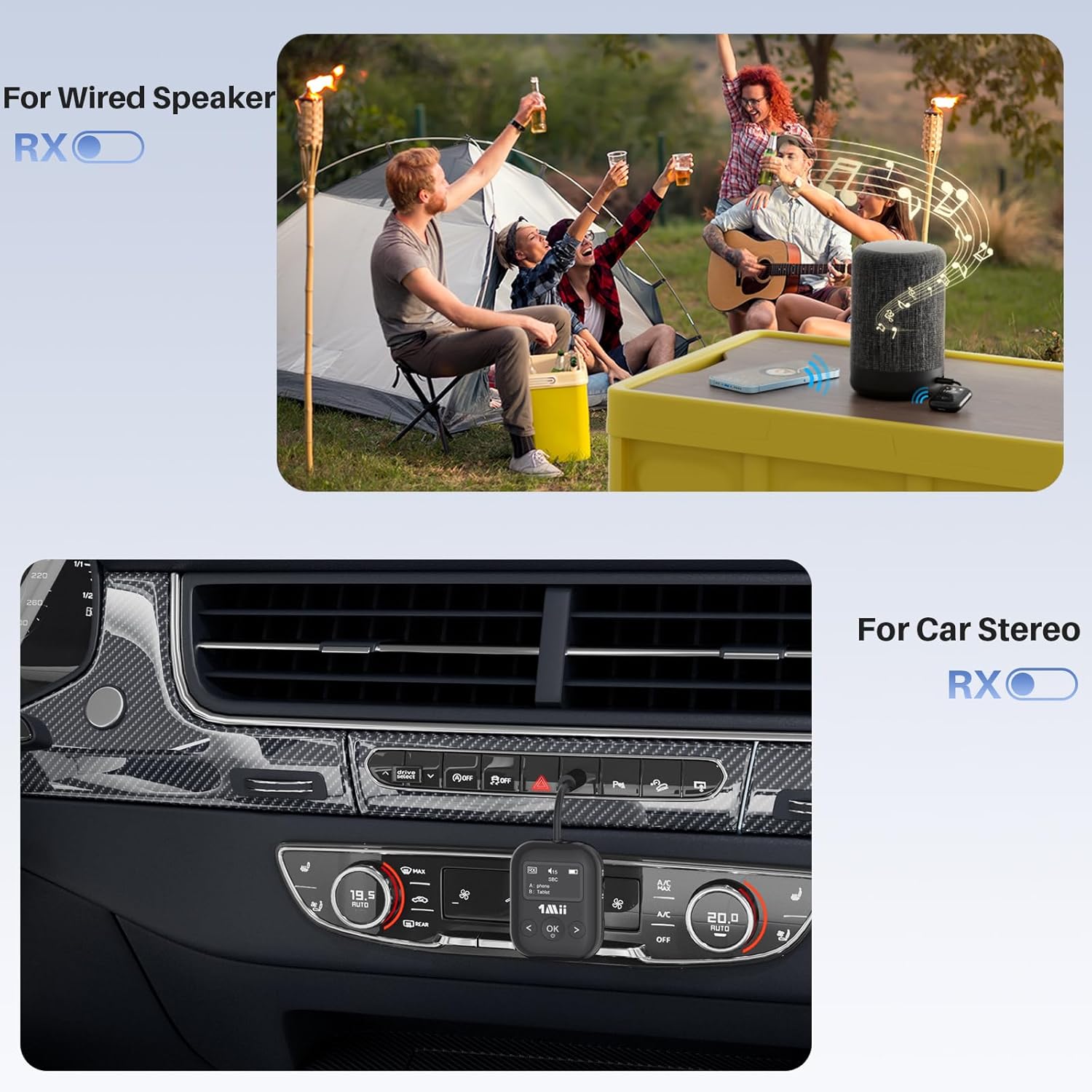 - 【2-in-1 Bluetooth Transmitter Receiver】 In transmitter mode, 1Mii Bluetooth transmitter allows you to stream audio from your no-Bluetooth device like TV, PC, airplane/gmy entertainment systems to your Bluetooth headphones/speaker. In receiver mode, 1Mii Bluetooth audio adapter allows you to connect the Bluetooth of your phone/tablet to your wired speaker, earphones, car stereo, home stereo.