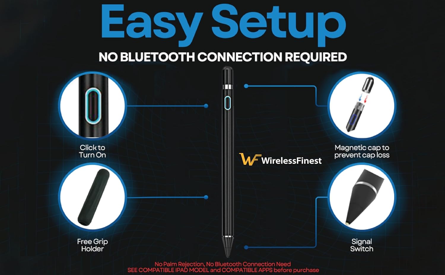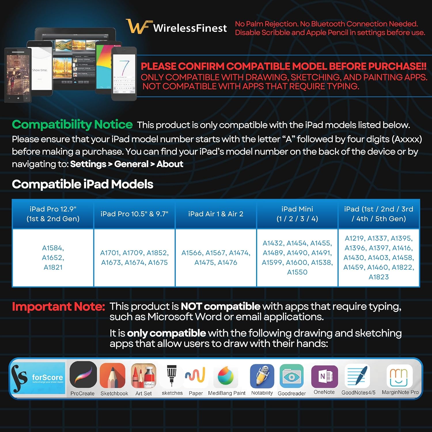 - MUST SEE COMPATIBLE MODEL NUMBER & APP IN DESCRIPTION. ONLY COMPATIBLE FOR Apple iPad Pro 1st iPad 1st 2nd 3rd 4th 5th iPad Mini 1 2 3 4 iPad Air 1st 2nd iOS. MAKE SURE CORRECT IPAD MODEL NUMBER & APP IN DESCRIPTION BEFORE PURCHASE. REMOVE BEFORE CONNECTED PENCIL BEFORE USE. NO PALM REJECTION.