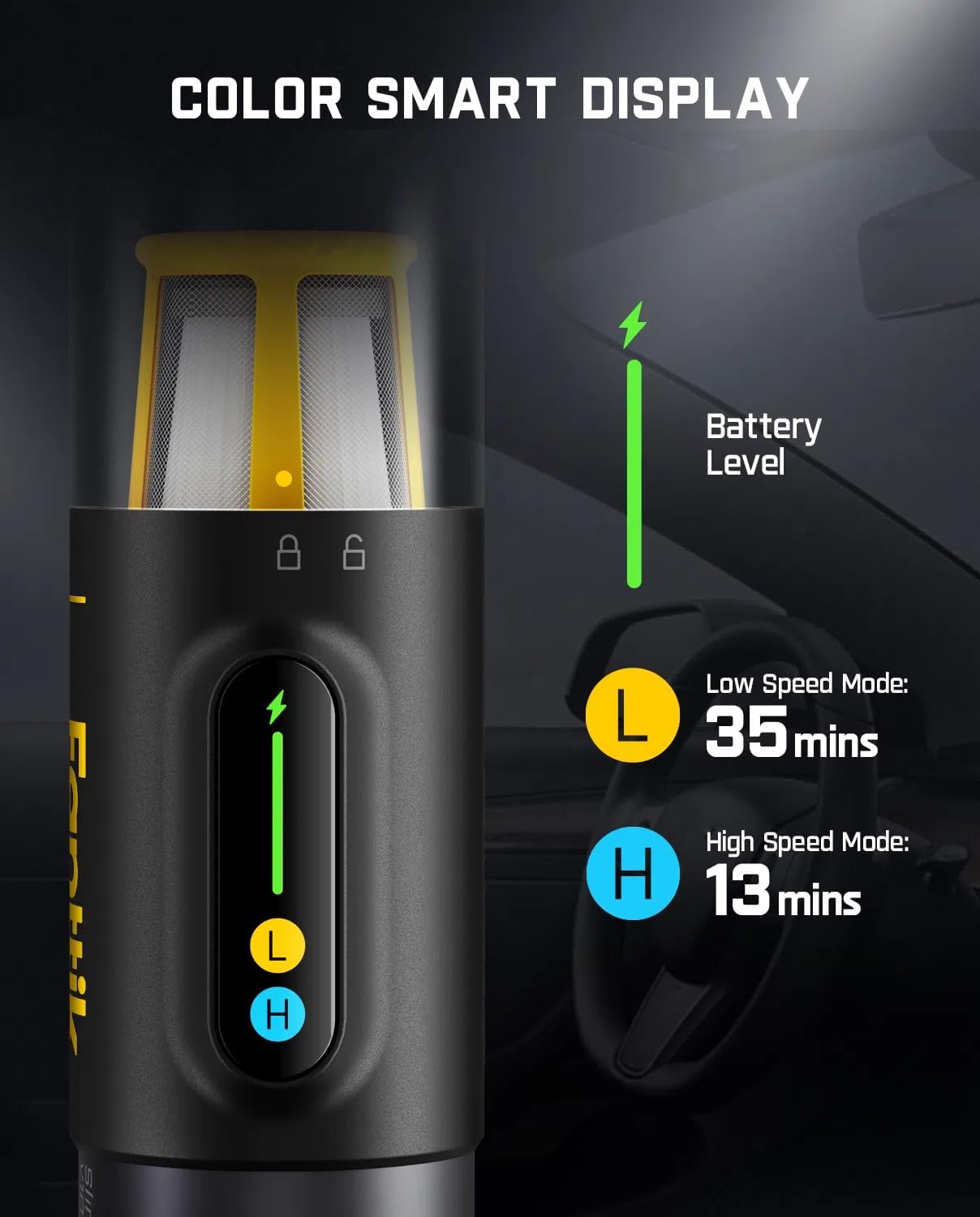 - Smart LED Display: This cordless car vacuum cleaner is equipped with a user-friendly LED display. With just a 1-second press, you can easily turn the device on or off. When you start it up, the display provides real-time updates on the battery level