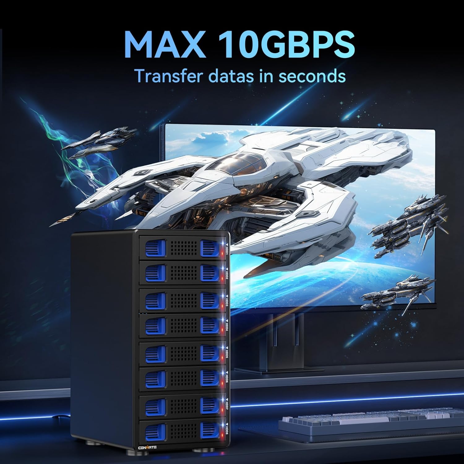 - 【Up to 10Gbps】This 8 bay enclosure equips with ASM2074*3+ASM235CM*8 chip and USB C 3.2 output interface, Max 10Gbps under UASP control.Transfer 1G movie in 3-5 seconds with USB 3.2 Ports, which is 20 times faster than USB 2.0. 8 HDDs total R/W speed 70-150MB/s.NOTE:Read and write speeds are determined by factors such as hard drive version, computer version, etc...