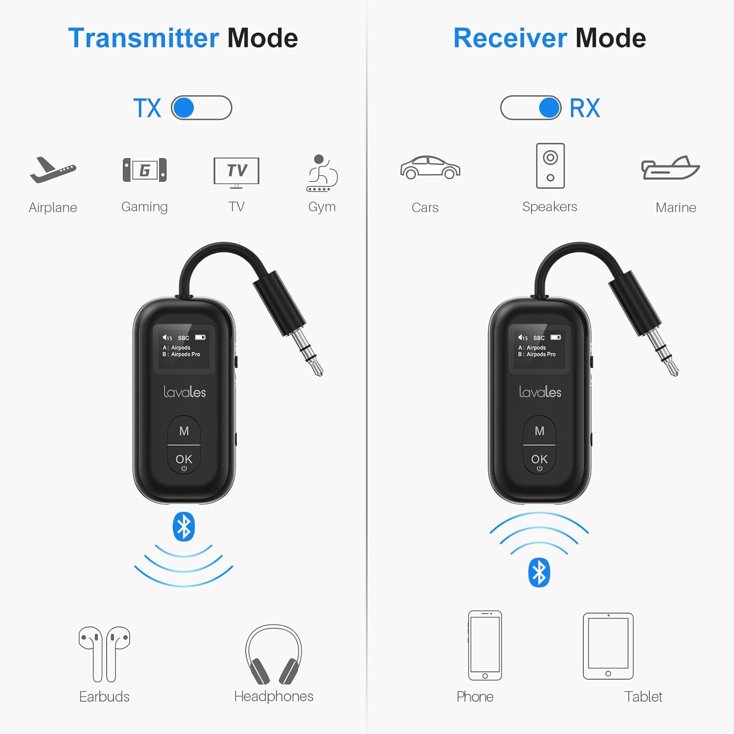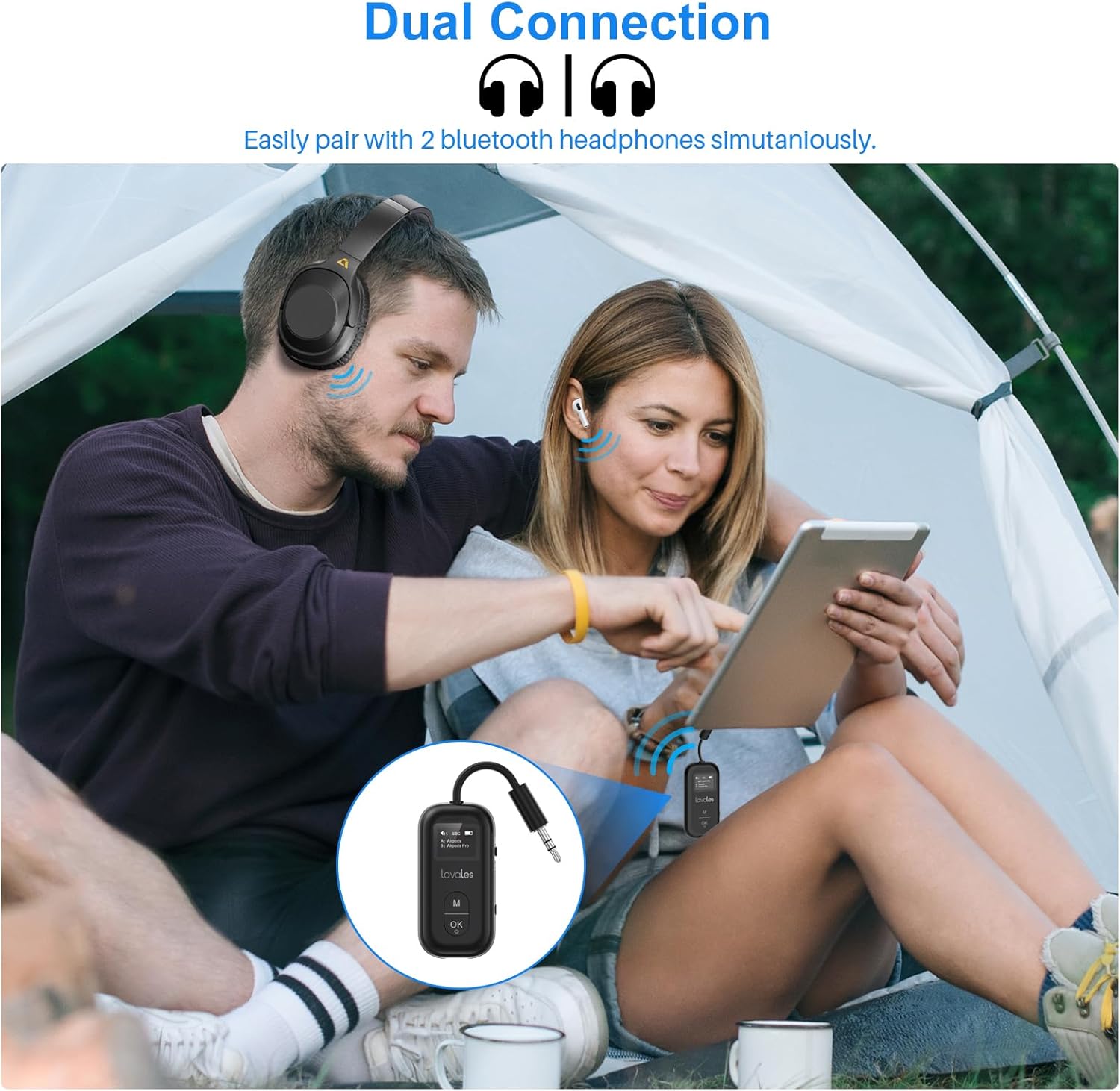 Bluetooth 5.3 Transmitter Receiver for Airplane to 2 Headphone – AptX Low Latency, 100ft Long Range, 25H Playtime, 2-in-1 Wireless Bluetooth Audio Adapter W/Screen for TV, Tablets, Speakers