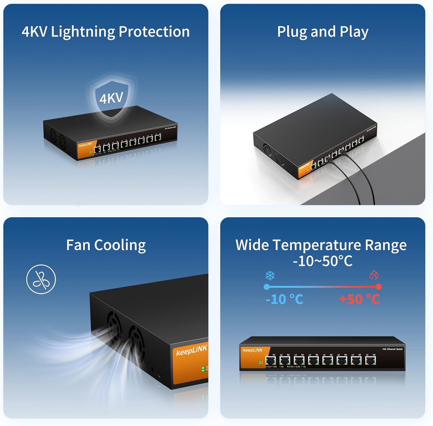 - 【Plug and Play】This 10Gbps ethernet switch is easy to use, just plug in the power cable and connect the ethernet cable to your devices with no configuration required.