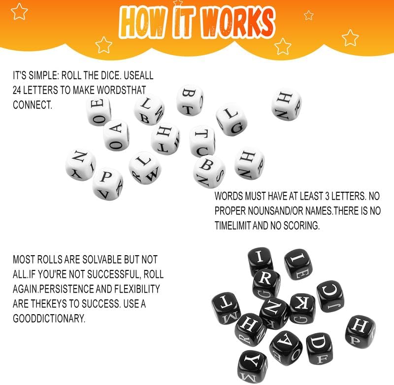 - Dice Letter Game: The game includes a carefully designed set of 6 faceted dice, each side printed with different English letters. Players create various interesting words by rolling dice and randomly combining letters that appear. Specially designed black and white dice,Can be used for parent-child interactive games,The game rules are simple and easy to understand,yet full of strategic elements.