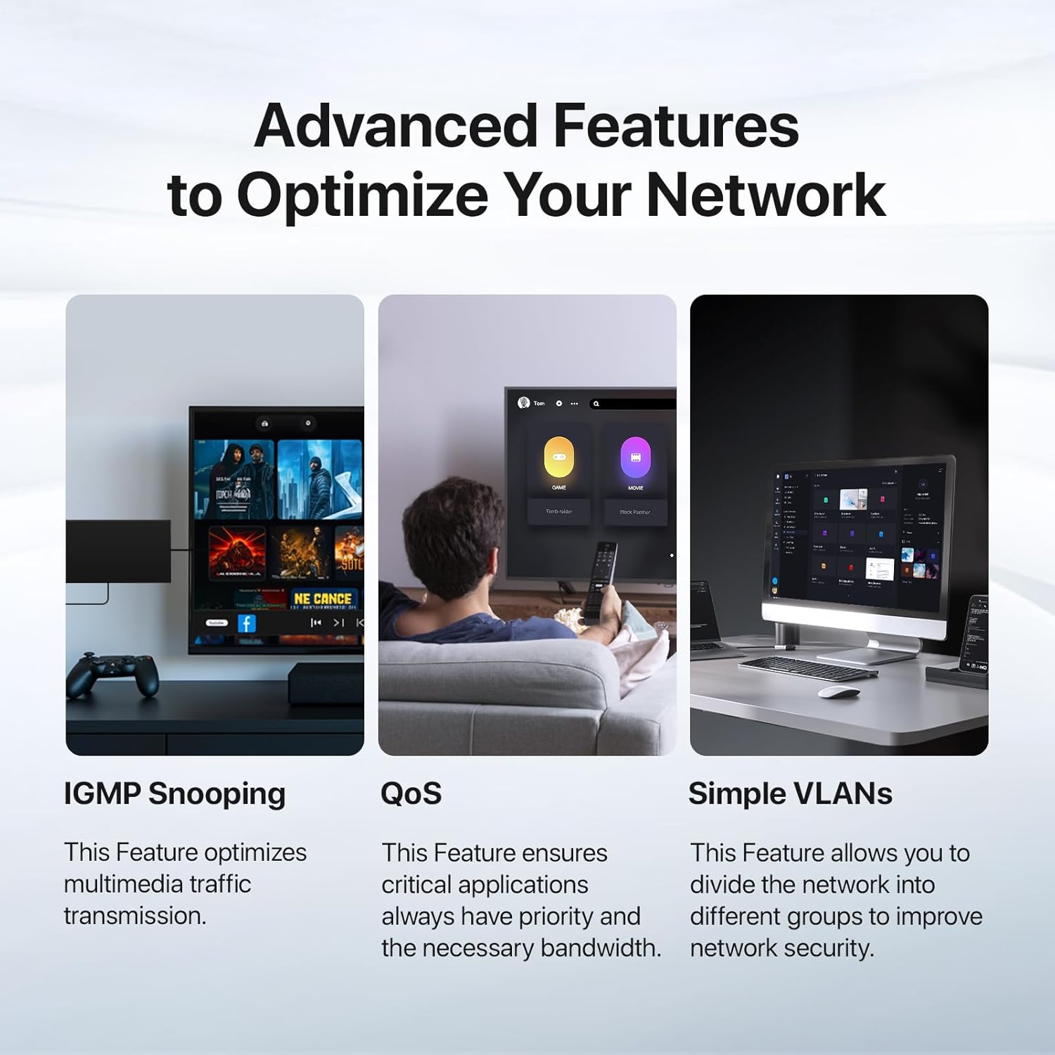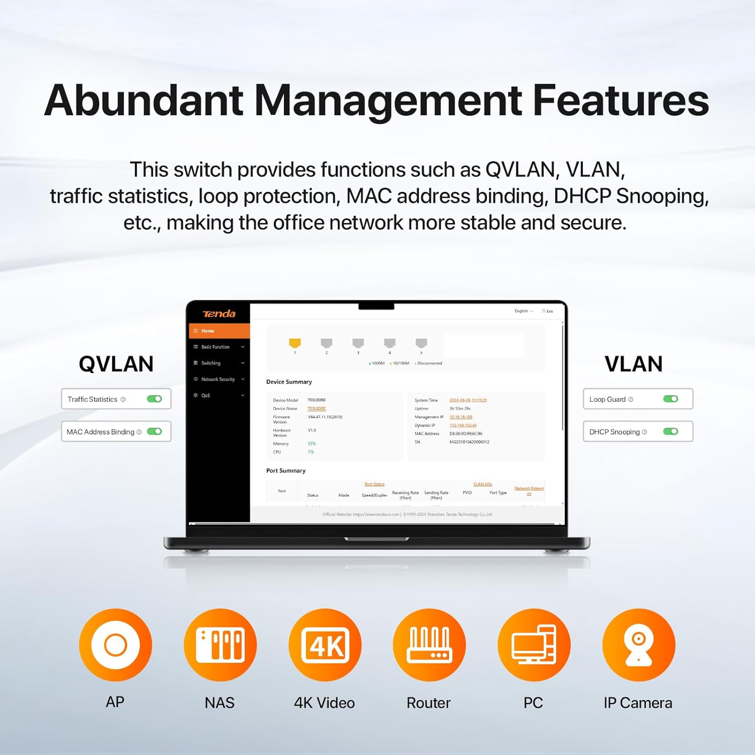 - 𝐕𝐞𝐫𝐬𝐚𝐭𝐢𝐥𝐞 𝐒𝐜𝐞𝐧𝐚𝐫𝐢𝐨𝐬: Equipped with QVLAN, VLAN passthrough, traffic statistics, loop guard, MAC binding, and DHCP Snooping.