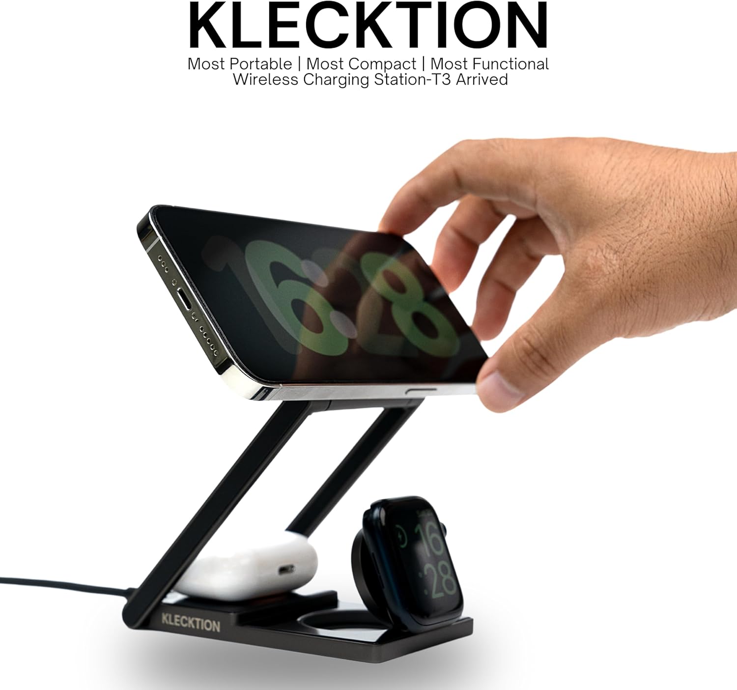 - [Advance Safe Wireless Charging] - KLECKTION T3 3-in-1 Portable Wireless Charging Station Specifically designed for Apple Mag-Safe chargers, the KLECKTION T3 offers a portable and efficient charging solution. Equipped with a 20W adapter (Adapter Version), it can fully charge your devices in approximately 2-3 hours, as validated through rigorous testing. Powered by advanced X3 chips, the T3 provides essential safety features, including over-current, over-voltage, over-temperature protection, and foreign object detection.Enjoy a worry-free and efficient charging experience with the KLECKTION T3 foldable Wireless Charging Station.