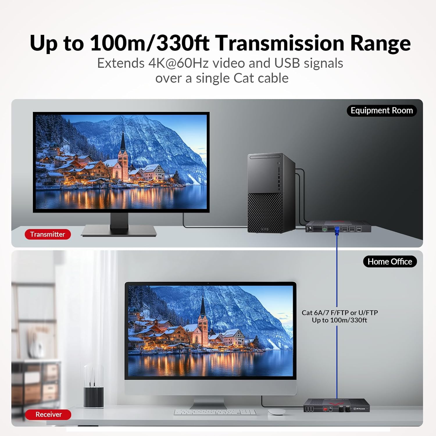 AV Access HDBaseT 3.0 HDMI KVM Extender, Uncompressed 5K@60H 4K@120Hz up to 100m/330ft, 144/165/240Hz Refresh Rate, Zero Latency (4KEX100-KVM-Pro)
