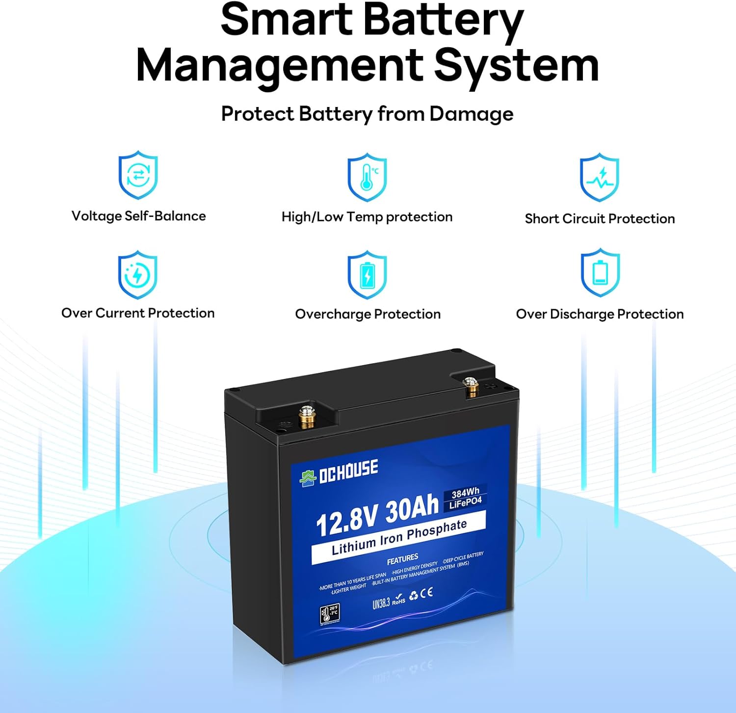 - [30A BMS Protection] Built in 30A BMS Management system,which protects 12 volt lithium battery from over charger and discharge, over current, short circuiting, cell voltage self balance for increased performance and longer life.