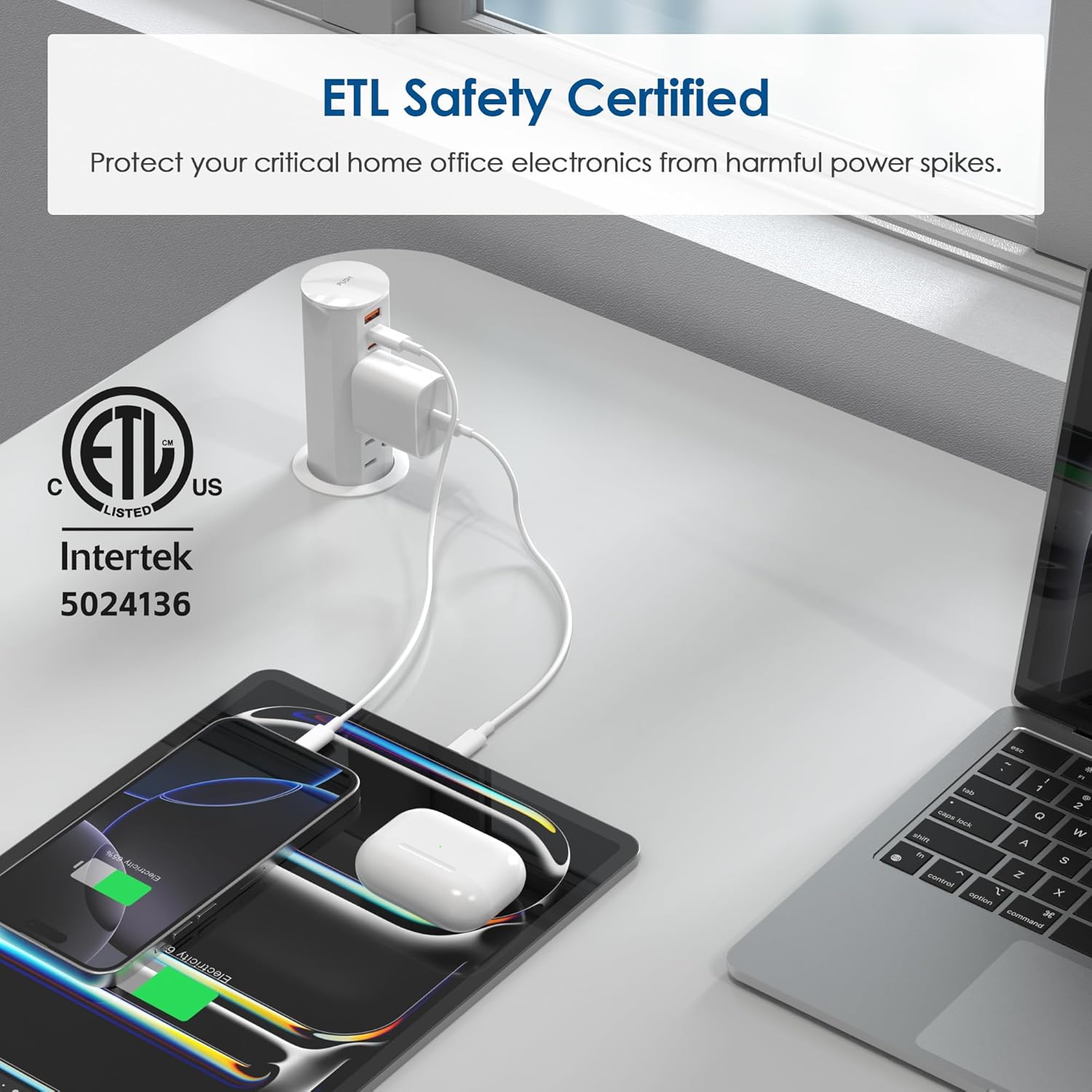 - Up to 5 Devices Charged Simultaneously: This embedded socket is a versatile solution for all your charging needs. It features 2 AC outlets and 3 USB ports (2 USB-C, 1 USB-A), with the USB ports supporting a maximum output power of up to 20W. Activating ultra-fast charging when connected via dual USB-C cables, it serves as the perfect desktop power hub. It can charge up to 5 devices at once without any clutter.Equipped with a durable 6-foot extension cord.