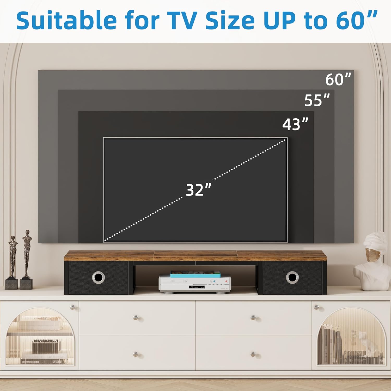 - 【TV Riser Stand】Dimensions: 45"L×11.8"W×6.5"H. Large TV riser stand can fit your 32 42 43 45 50 55 60 inch tvs, monitor stands for 2 monitors(up to 32"). Raise your tv and offer extra storage space for your items. Ideal for your living room,bedroom,office.
