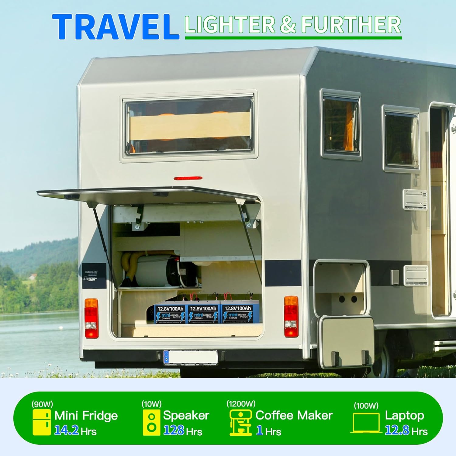 - 💯【Weighs 20.89lbs, 10% Lighter Than Ever】This 12 volt lithium battery 100ah mini be your first choice for every outdoor decision, weighs only 20.89lbs, 10% lighter than ever. (The 12V 100Ah Basic version: weighs 22.57lbs) It will be easier to maintain, move and take on the go.