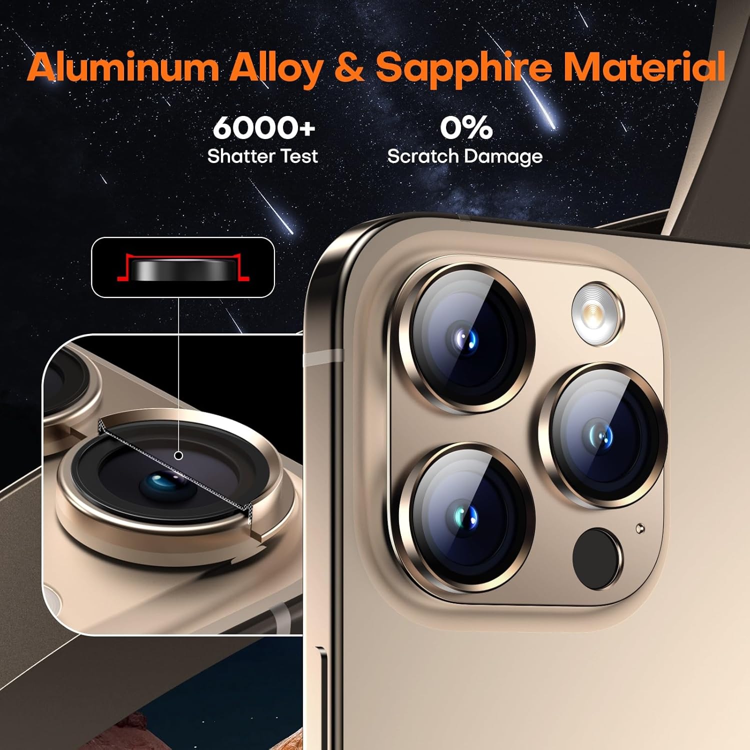- [Military-Grade Protection] Wumigoo for iPhone 16 Pro Max/16 Pro/15 Pro Max/15 Pro/14 Pro Max/14 Pro camera covers are crafted from aerospace aluminum alloy and sapphire material. Upgraded materials and robust structure ensure the camera lens is resistant to scratches, impacts, and dust. We integrate frosted metal plates with tempered glass to enhance its effectiveness in dissipating impact forces and providing full protection. Maximally shields the phone from scratches, scuffs, and collisions.