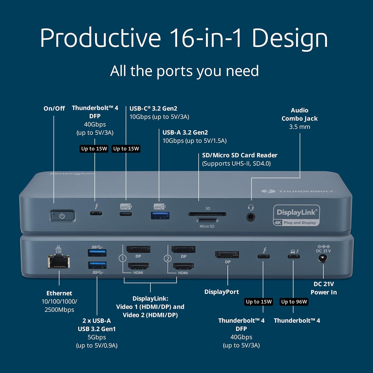 - Productive 16-in-1 Design - Includes 2 x downstream Thunderbolt 4 ports (40Gbps) capable of data, video, and audio (5V 3A), 1 x USB-C 3.2 Gen2 10Gbps (5V 3A), 1 x USB-A 3.2 Gen2 10Gbps (5V 1.5A), 2 x USB-A 3.2 Gen1 5Gbps (5V .9A), 2 x HDMI/DP, 1 x DP, 1 x 3.5mm combo audio jack, 1 x SD Card reader, 1 x Micro SD Card reader, and 1 x 2.5Gbps Ethernet