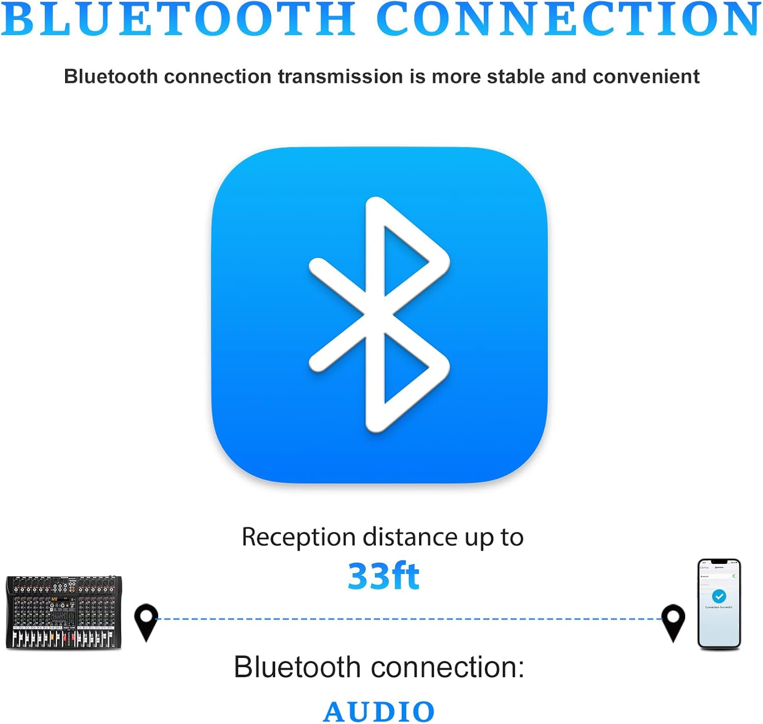 - 【Bluetooth Connection】 Effortlessly pair your devices with our mixer's built-in Bluetooth control. Stream music or voice directly from tablets and phones, and manage playback with integrated controls for play/pause, song switching, and mode selection. Enjoy a reliable Bluetooth connection within a 33-foot range. And it supports U disk/Flash Reader/MP3 playback for versatile use