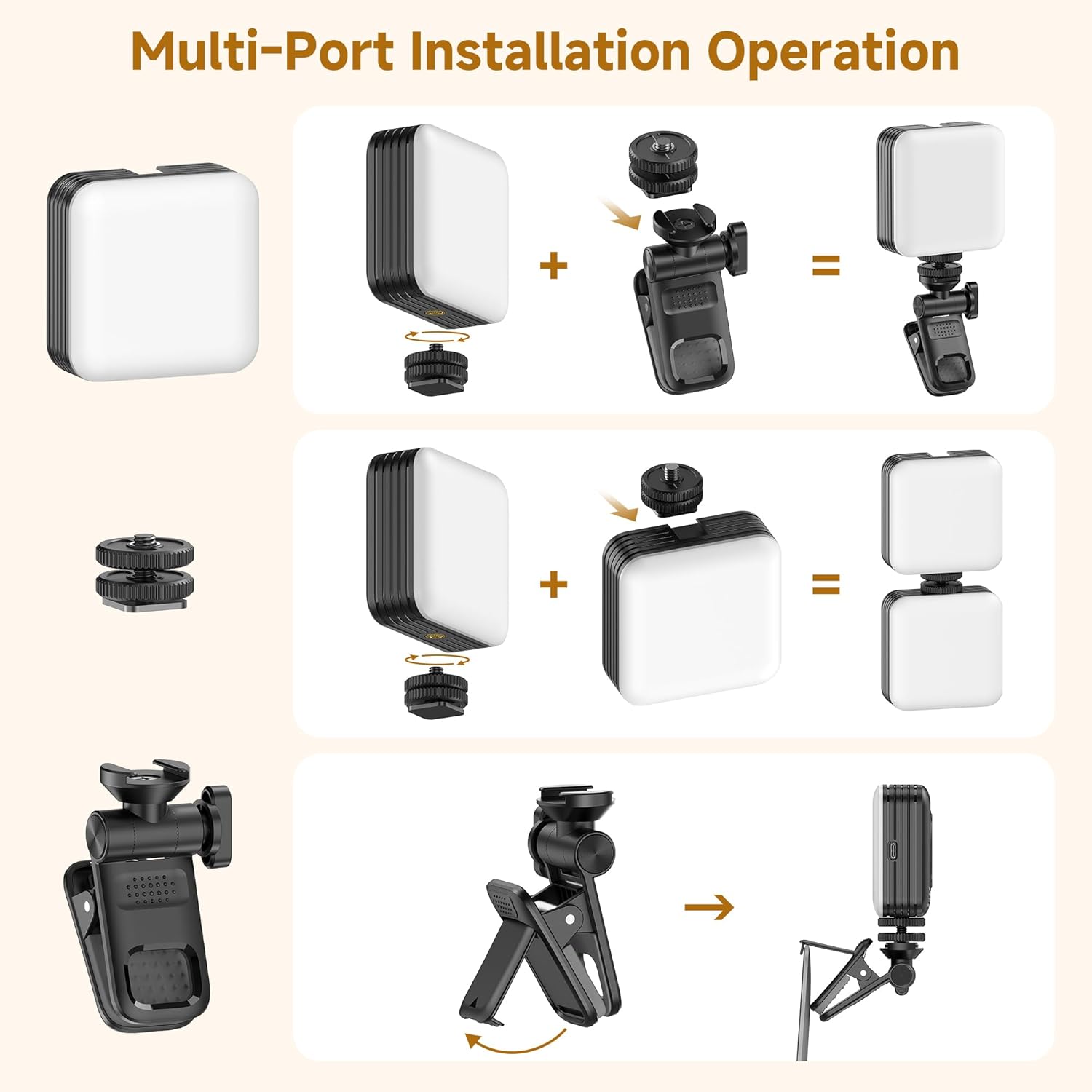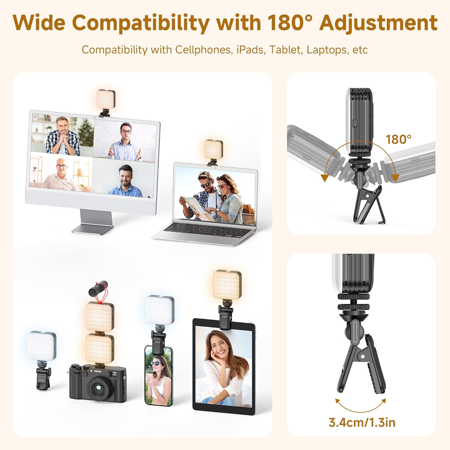 - COMPREHENSIVE COMPATIBILITY: On the clip of the mobile phone light there is a silicone pad to protect the device and allow stable mounting on different devices selfie light with 180° adjustable angle ensures the perfect lighting at any angle, so you can choose the right light angle when taking photos without blocking the camera or screen. Besides users a 1/4 thread clip and a cold shoe to meet different requirements. You can install on camera, computer, tablets, tripod and selfie stick, etc