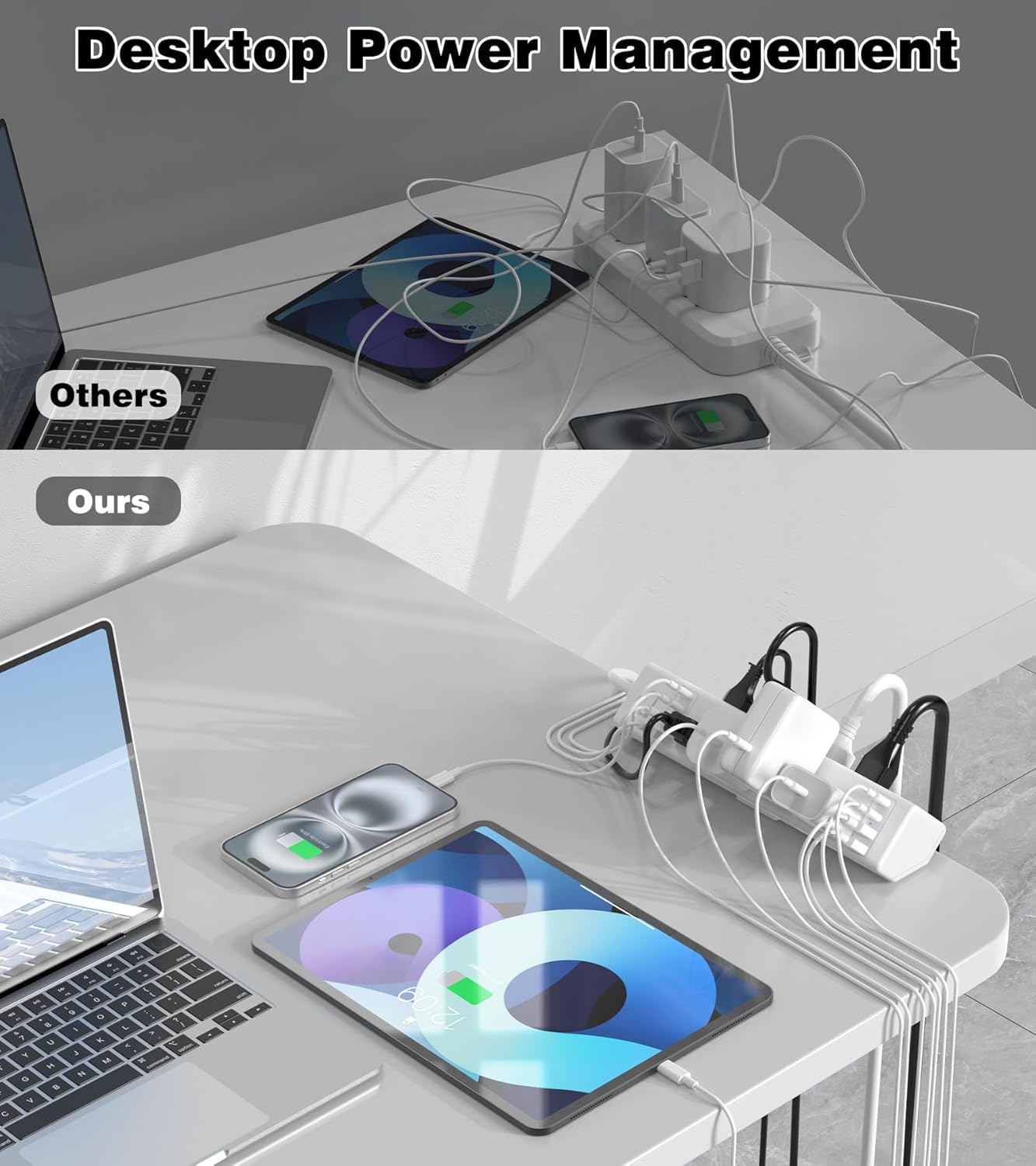 - 【16-in-1 Desktop Clamp Power Strip with USB Ports】This under desk power strip combines 8 widely spaced outlets (125V15A/1875W) and 8 USB ports (4 USB-A, 4 USB-C), providing power and charging for up to 16 devices, simultaneously to save more time, helping to keep your desk organizer.
