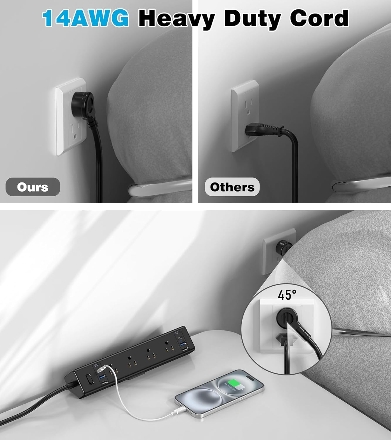 - 【45° Flat Plug & 14AWG Heavy Duty Power Cord】The 45° flat plug allows easy access to wall sockets, even in tight spaces or behind furniture. Comes with a 14AWG heavy duty 10Ft power cord. Adopting pure copper wire core to prevent equipment overload and short circuit, it can protect your equipment well.