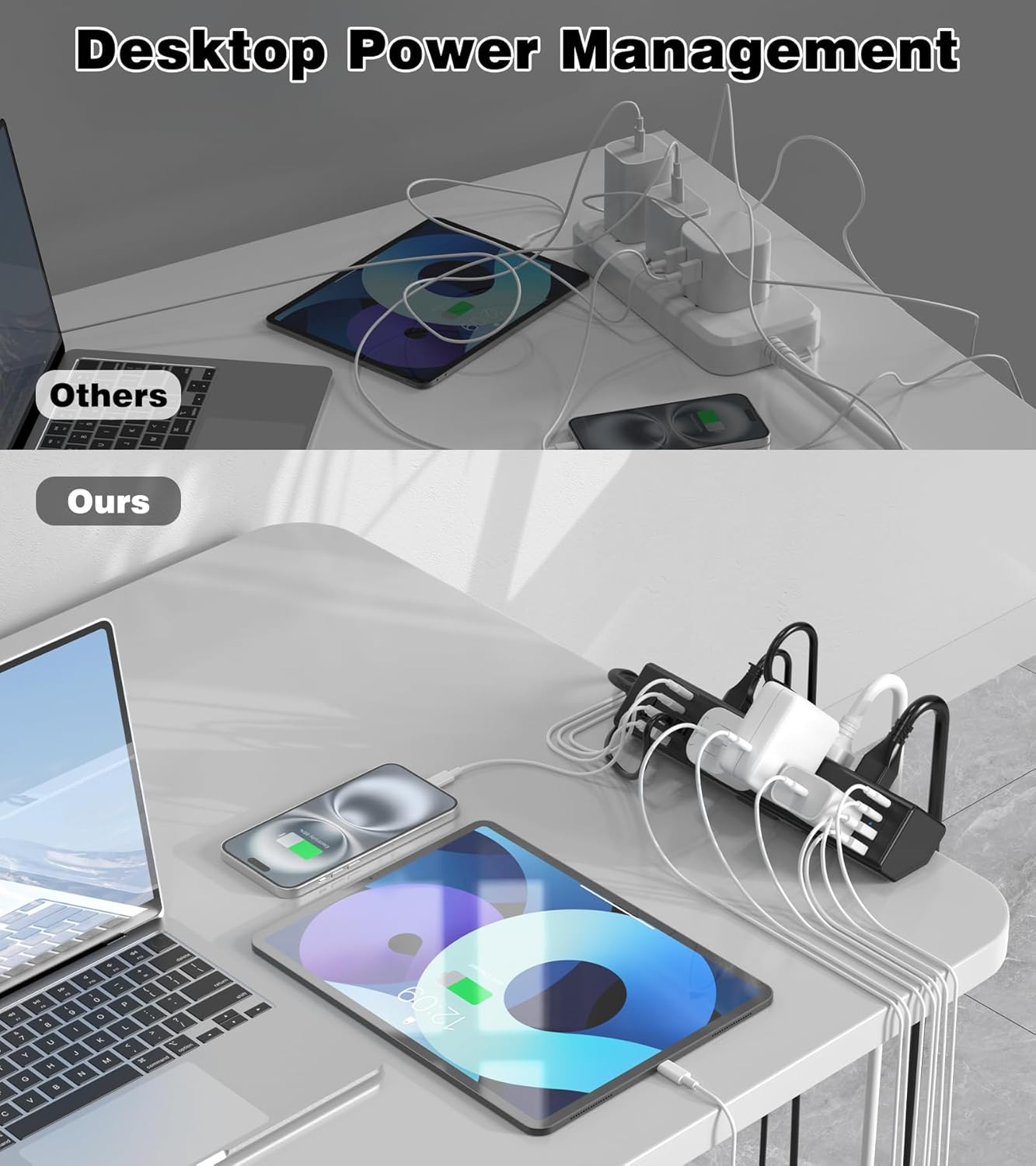 - 【16-in-1 Desktop Clamp Power Strip with USB Ports】This under desk power strip combines 8 widely spaced outlets (125V15A/1875W) and 8 USB ports (4 USB-A, 4 USB-C), providing power and charging for up to 16 devices, simultaneously to save more time, helping to keep your desk organizer.