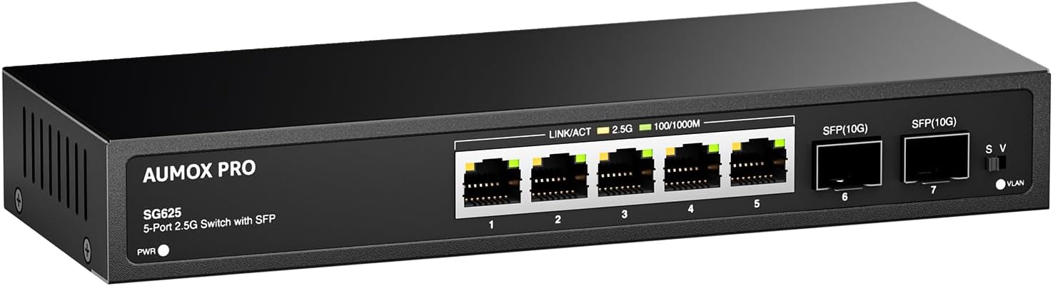 7 Port 2.5Gb Unmanaged Ethernet Switch with 5* 2.5G Base-T Ports, 2*10G SFP Ports, AUMOX PRO 65 Gbps Vlan Switching Capacity Compatible with 100/1000/2500Mbps Plug and Play