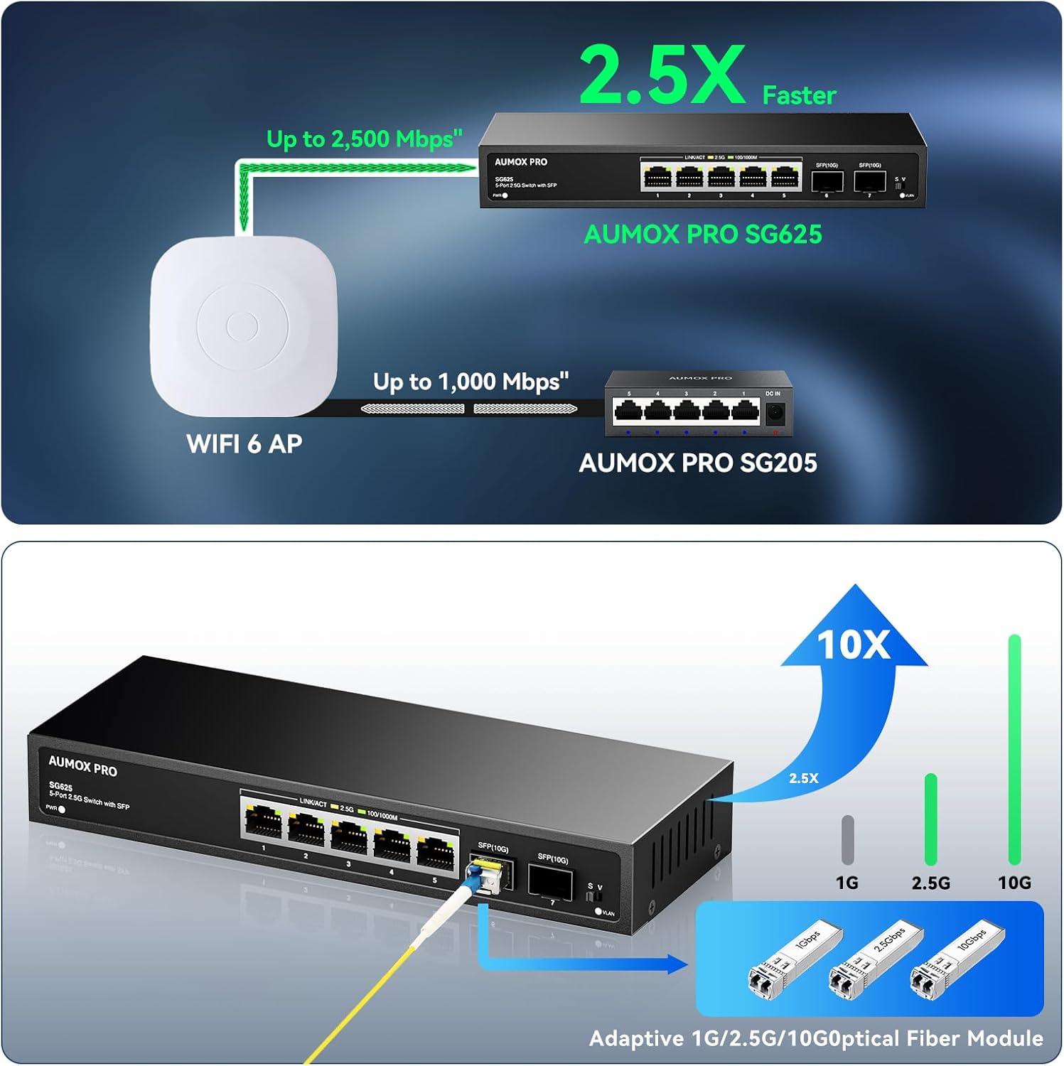 - 【Super-Fast Connections】AUMOX PRO 2.5G ethernet switch delivers 2.5x faster network performance than traditional Gigabit switches. With a switching capacity of up to 65 Gbps. Provides super-fast connections to 2.5G NAS, 2.5G Server, gaming computer, 2.5G WiFi 6 AP, 4K video, and more